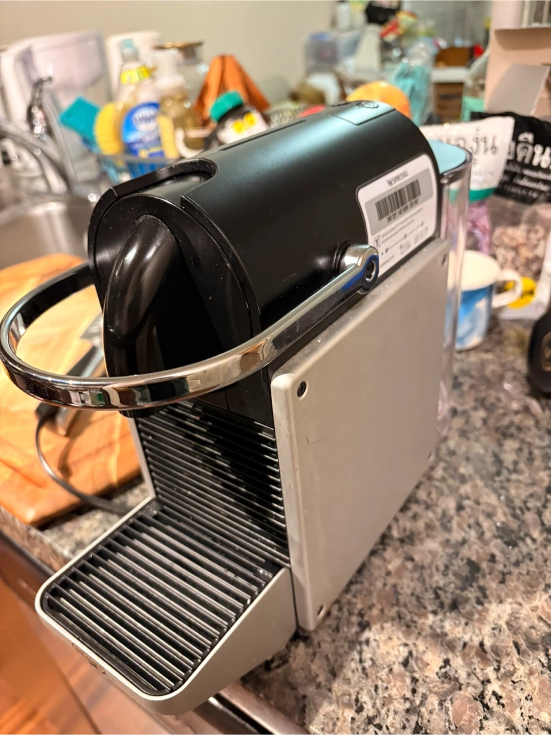 Selling a Nespresso Essenza Mini coffee machine in black and grey. It's compact and perfect for small spaces. Enjoy a quick and easy espresso with this machine!