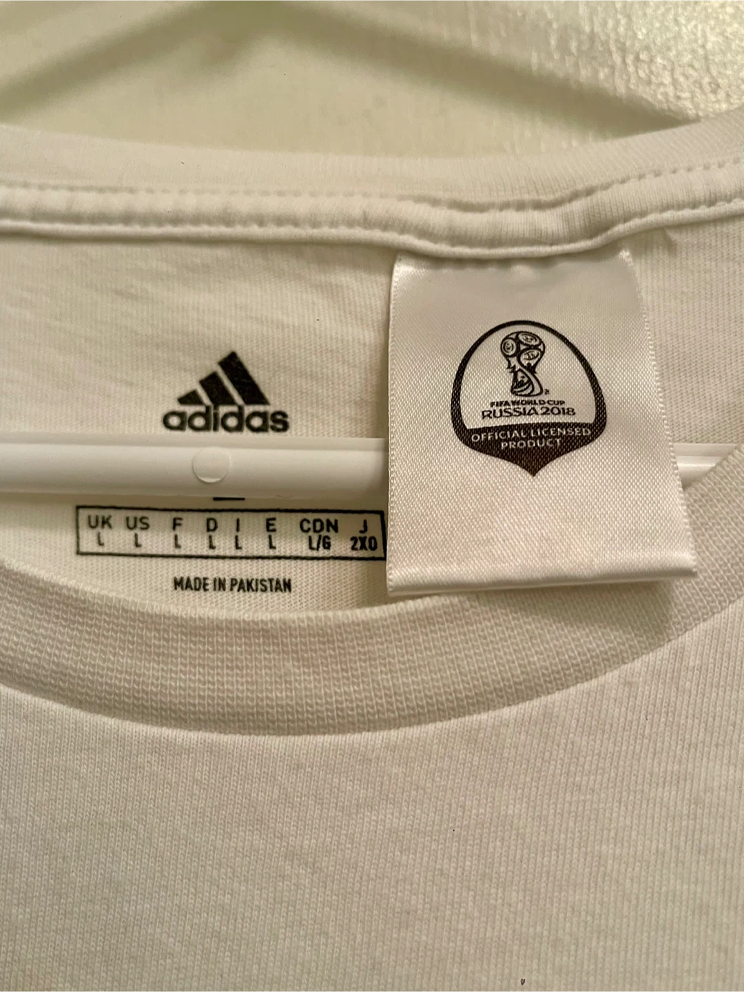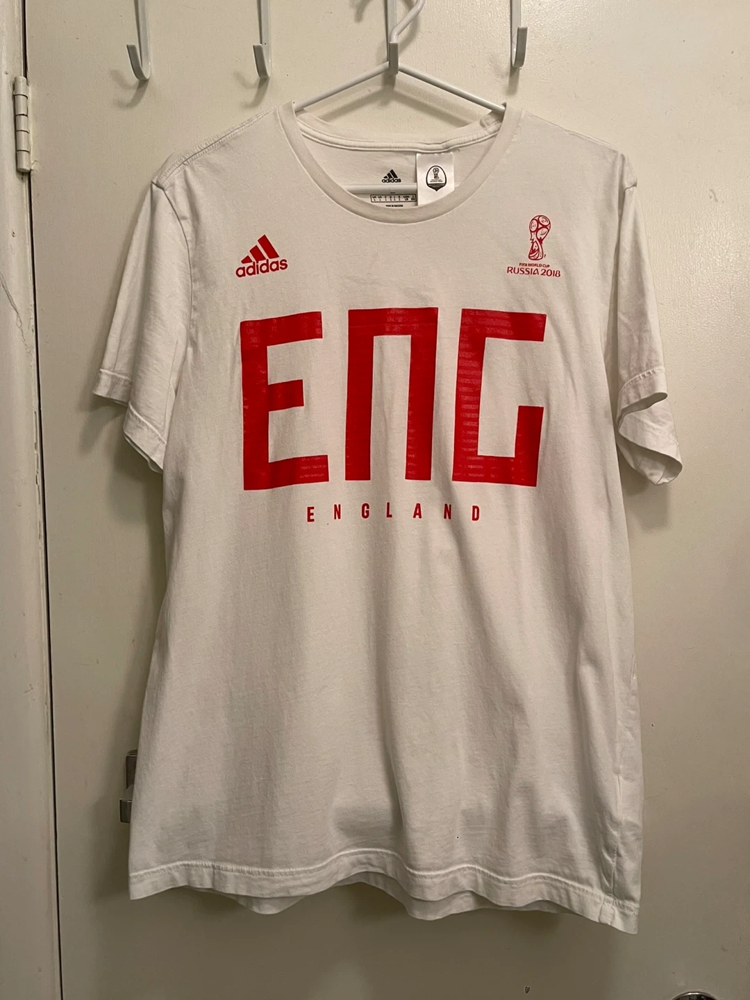Adidas England FIFA World Cup Russia 2018 officially licensed T-shirt in size L. The shirt is white with red lettering. It's in excellent, clean condition.