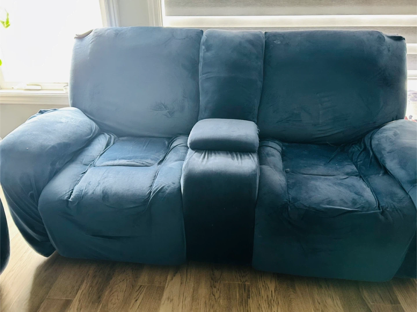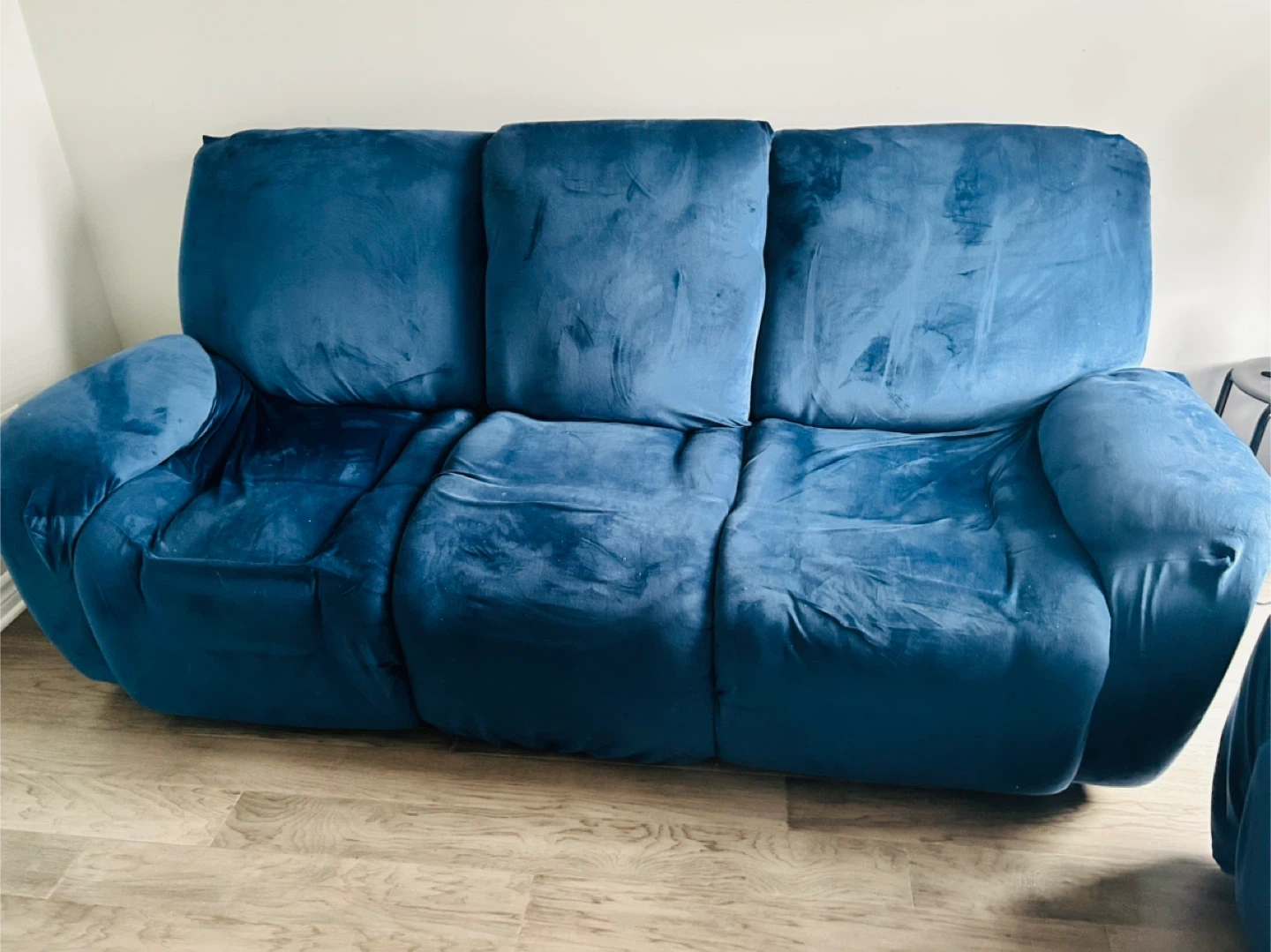 Selling a comfy reclining sofa. It's in good condition and ready for a new home! Perfect for relaxing after a long day.