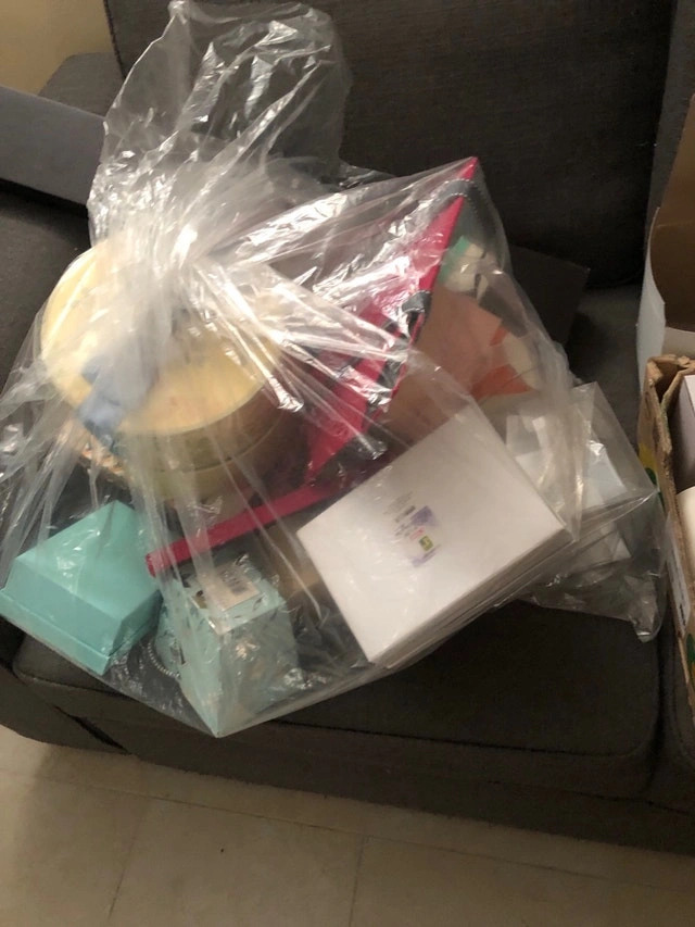 Several cups, including two from Indigo (regular price $15 plus tax), Roger items, wrapping gift boxes, a teacher's cup with markers, a pitcher, and a bag full of gift bags and wrapping paper. Asking $30 for everything OBO.