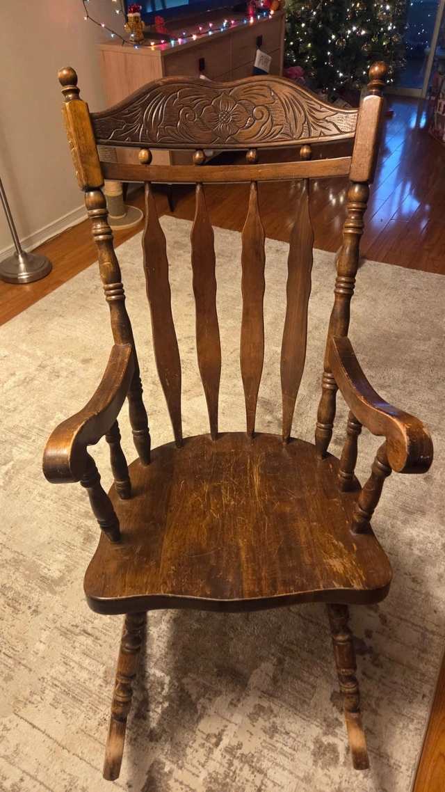This is a vintage rocking chair with a beautiful wood finish and ornate detailing on the headrest. Being that it's vintage, it shows wear from its age, and is sold as is. It's perfect for adding a touch of classic charm to any room!