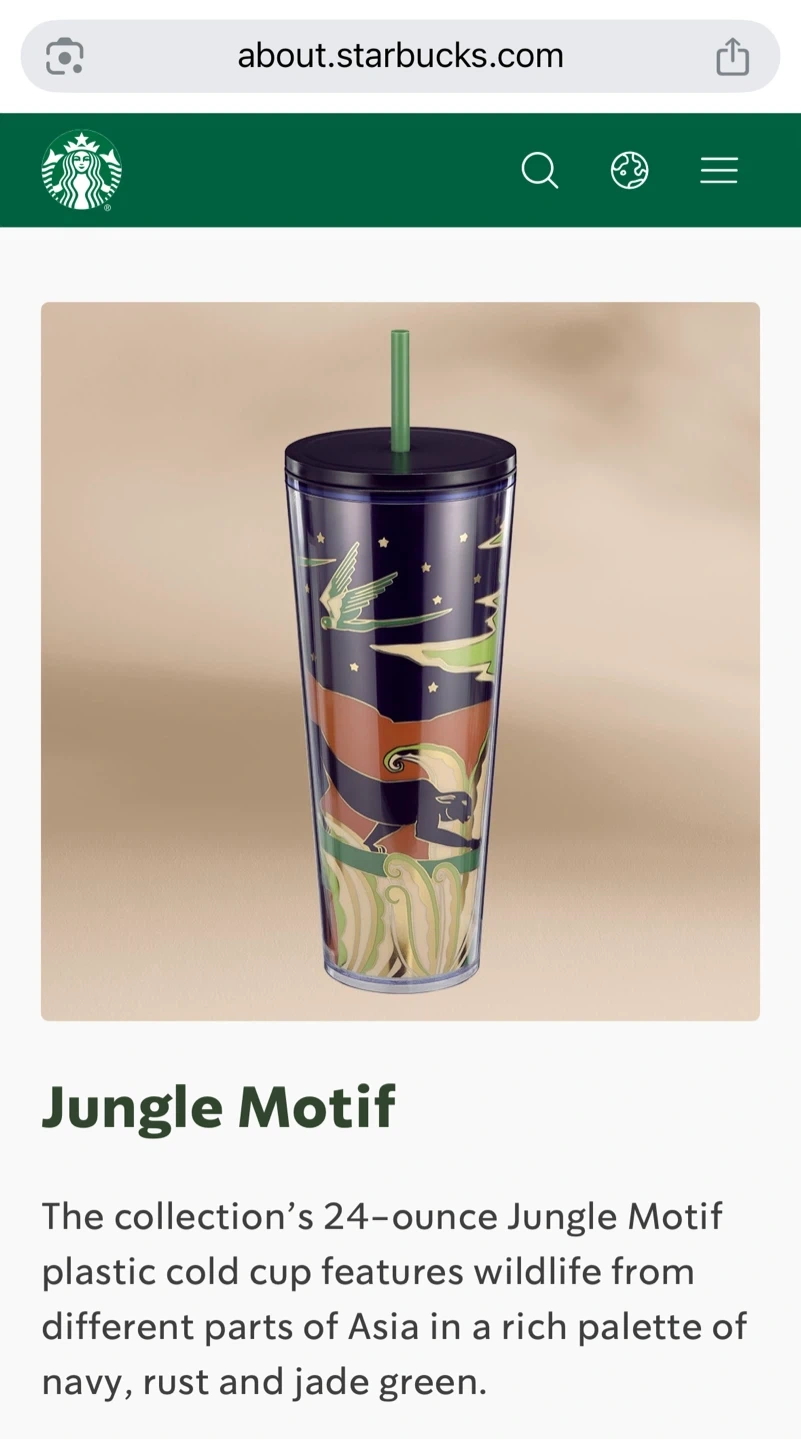 The collection’s 24-ounce Jungle Motif plastic cold cup features wildlife from different parts of Asia in a rich palette of navy, rust and jade green.