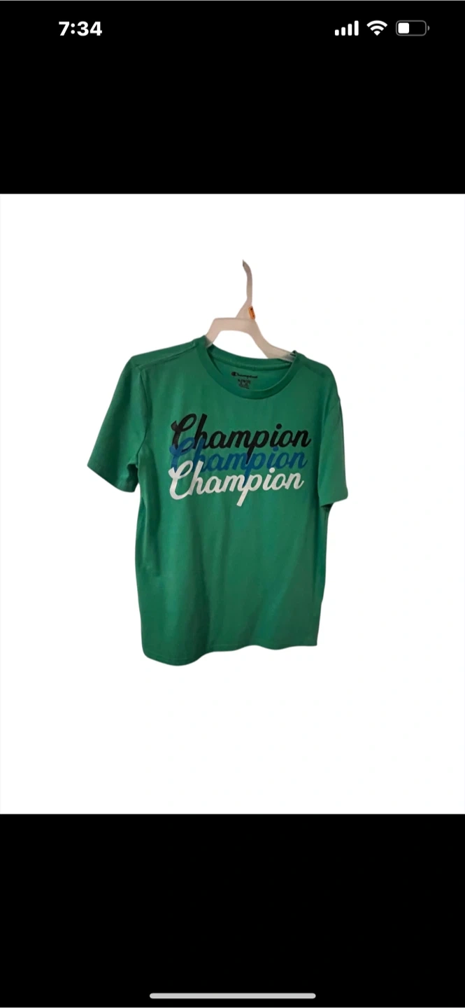Selling a green Champion T-shirt in size small. The shirt features the Champion logo in a layered design. It's in good condition and ready for a new owner!