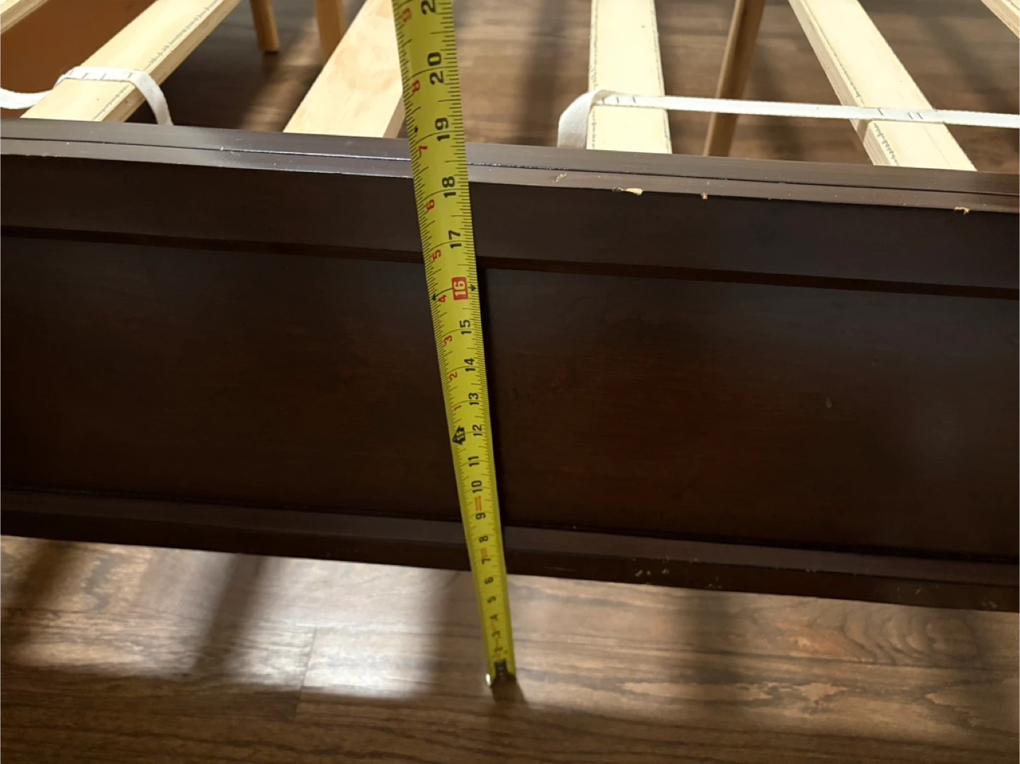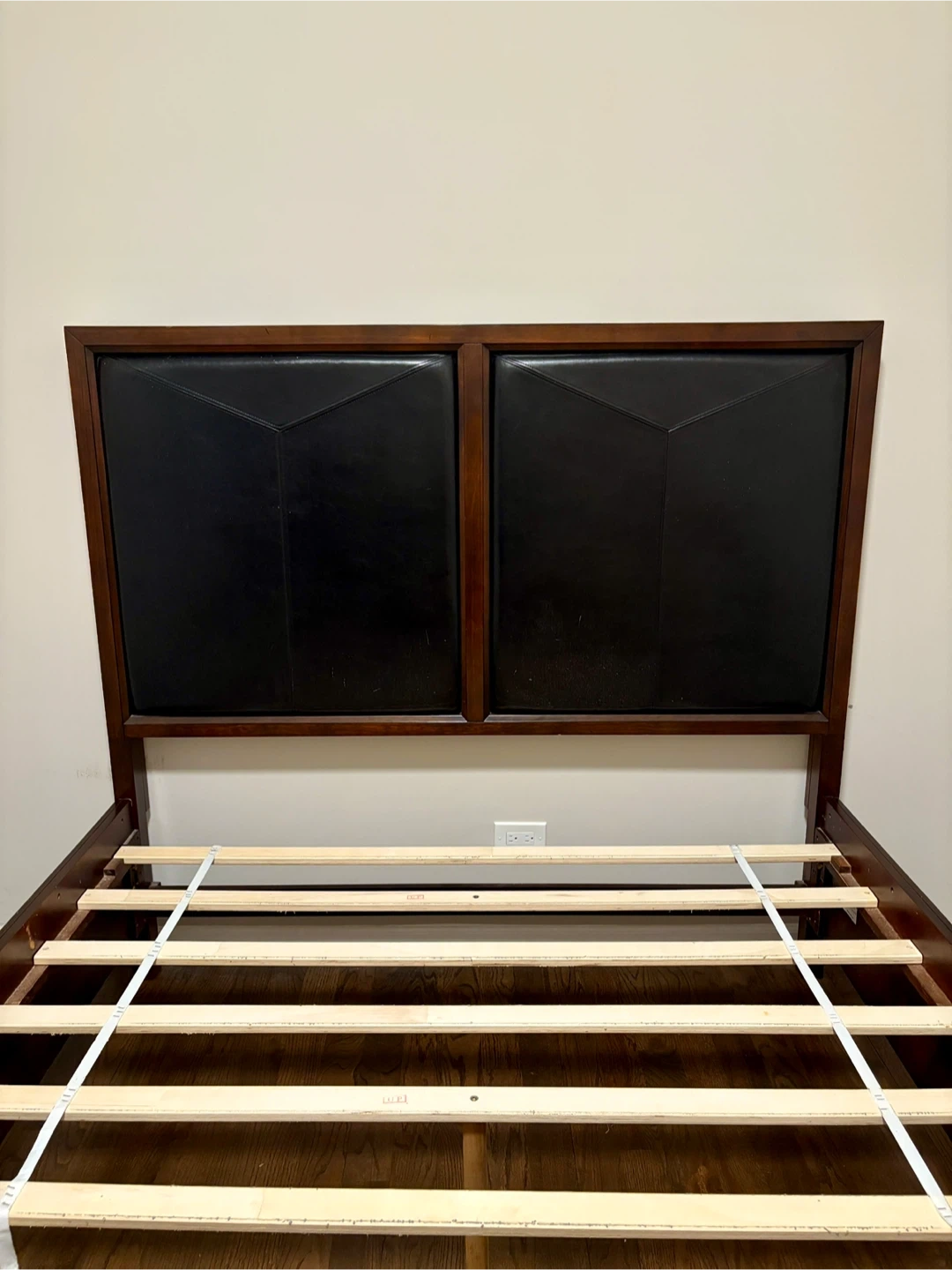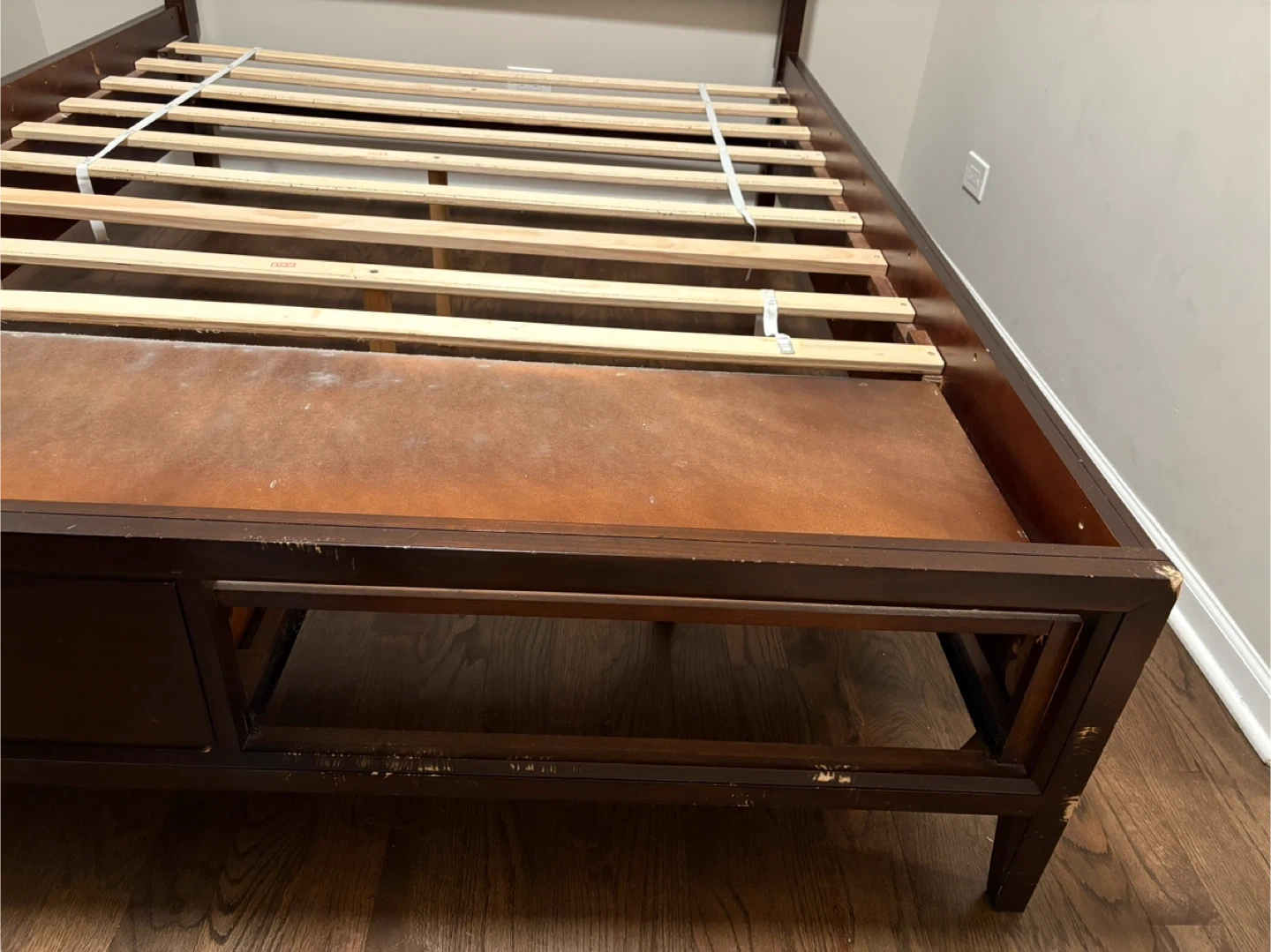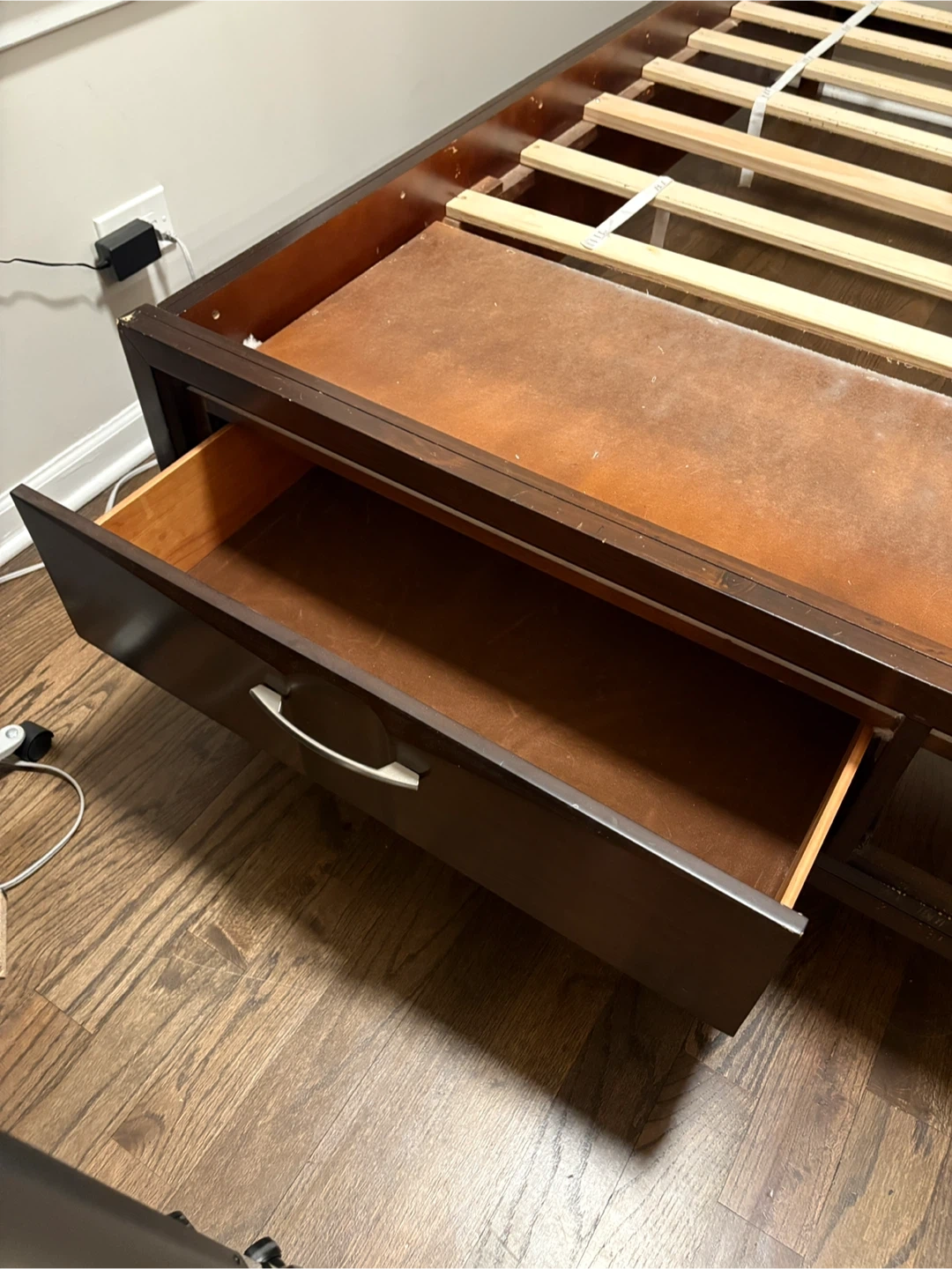 Selling a queen-sized bed frame. It comes with a headboard and built-in storage drawers. The frame is a dark wood color with a black headboard. It's in good condition and ready for a new home!