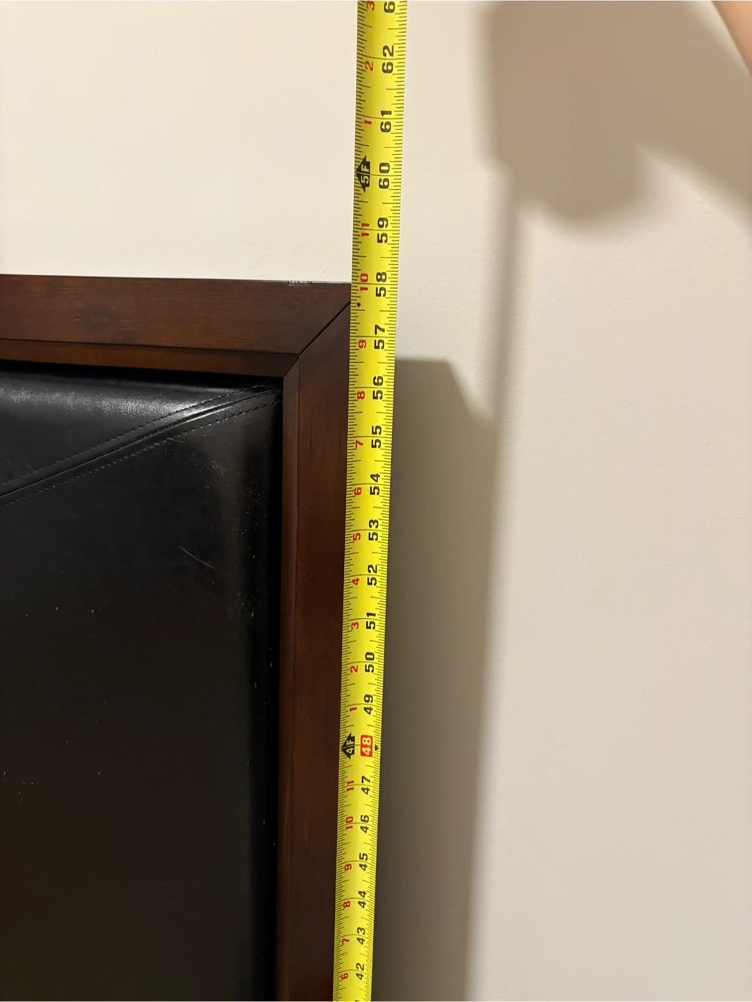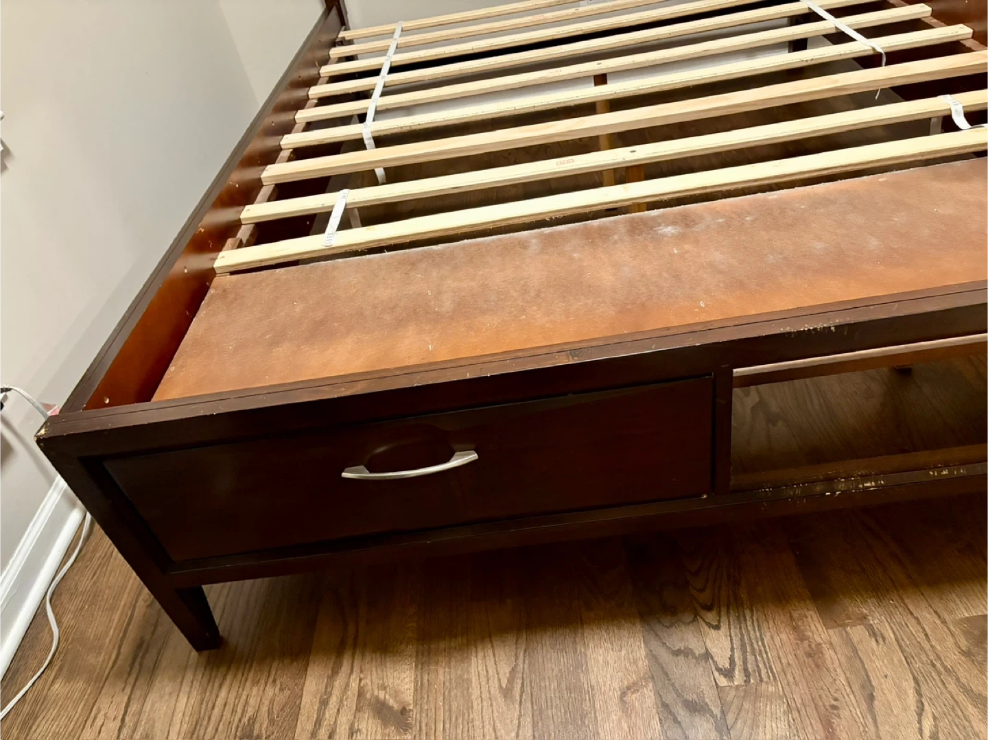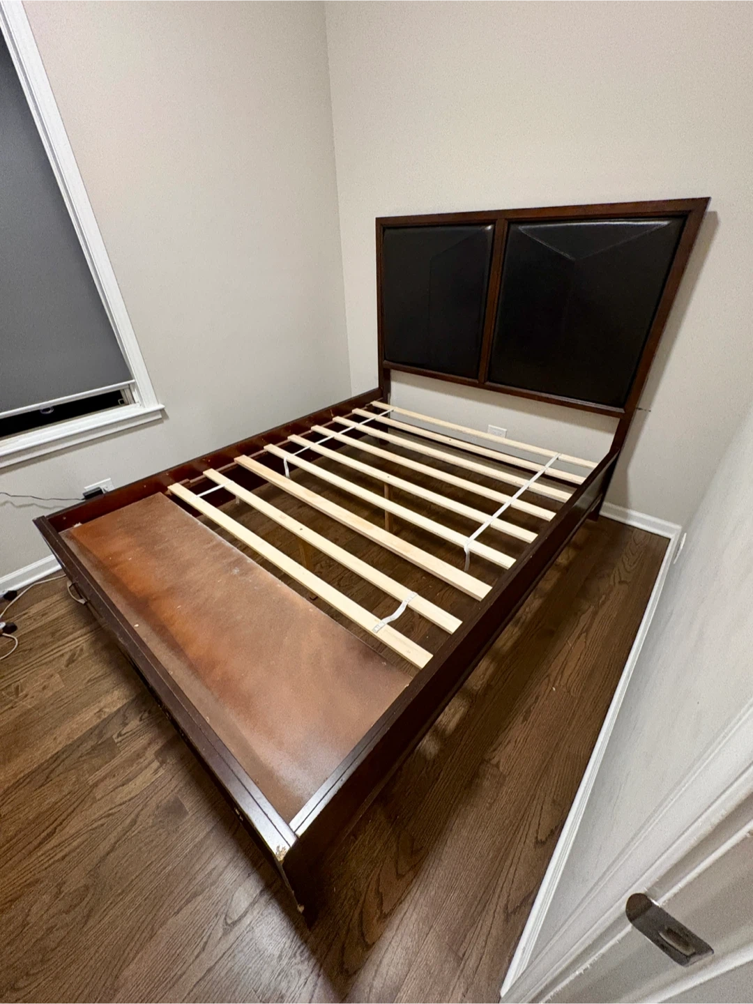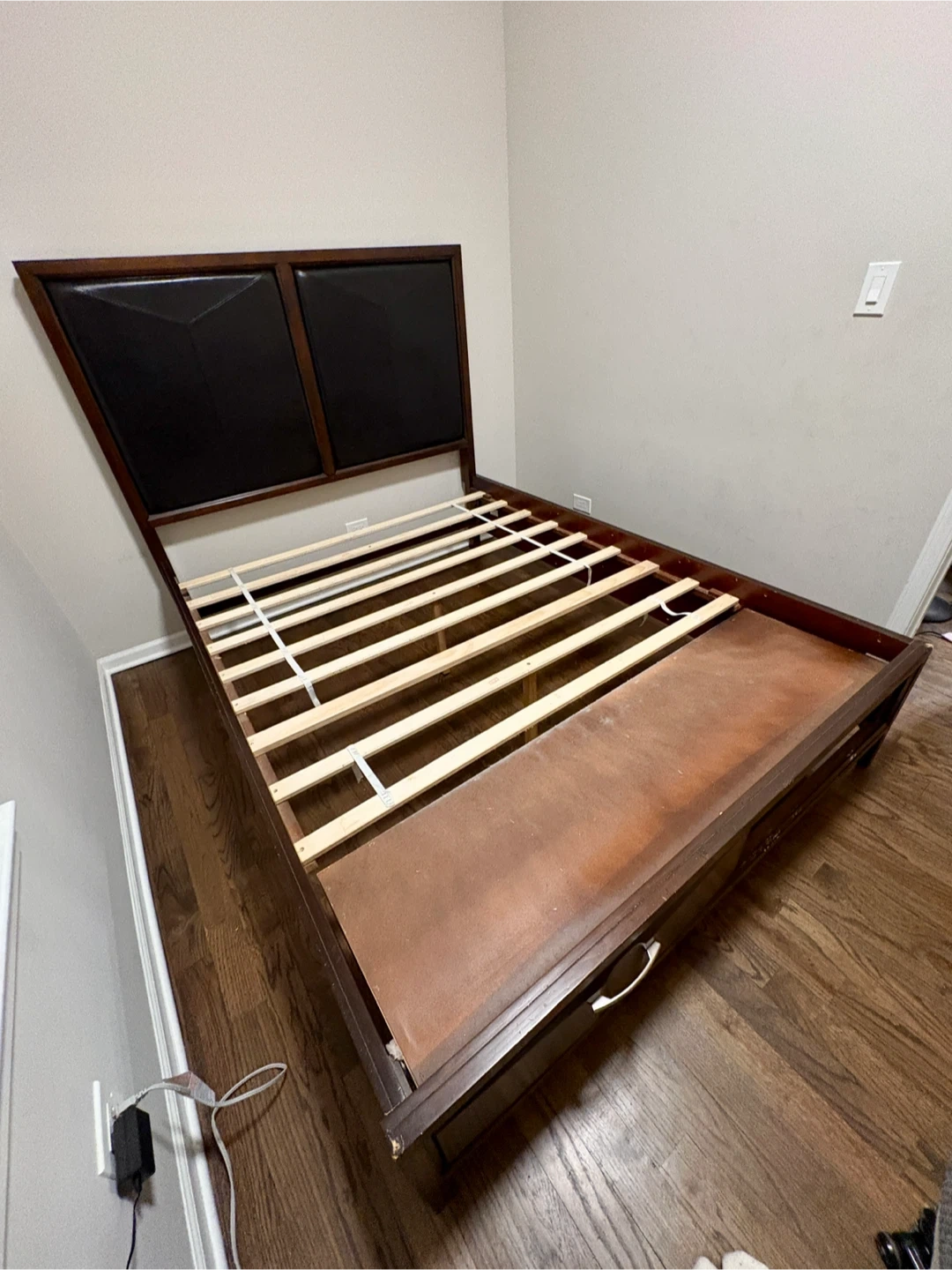 Selling a queen-sized bed frame. It comes with a headboard and built-in storage drawers. The frame is a dark wood color with a black headboard. It's in good condition and ready for a new home!
