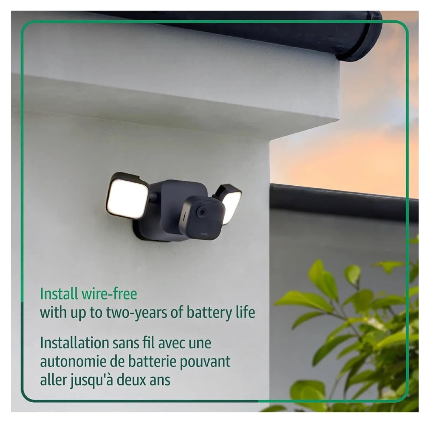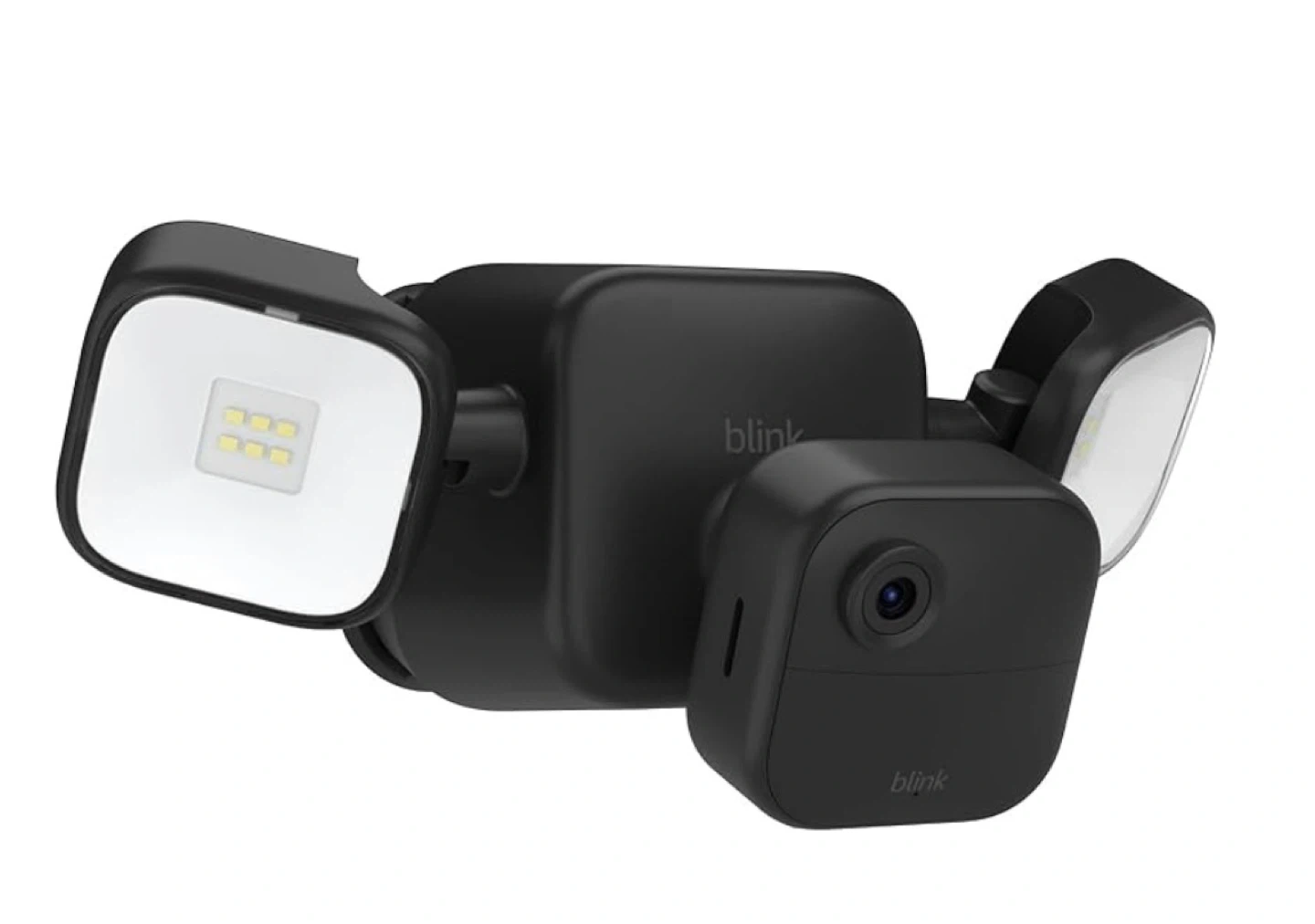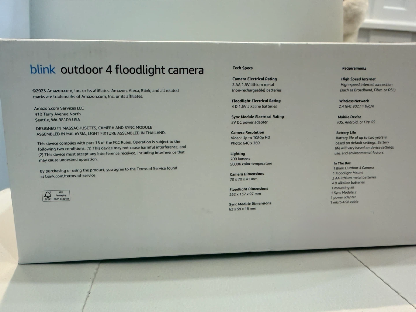 It provides 700 lumens of LED lighting and works with Alexa. The box includes the Blink Outdoor 4 Camera, floodlight mount, AA lithium metal batteries.