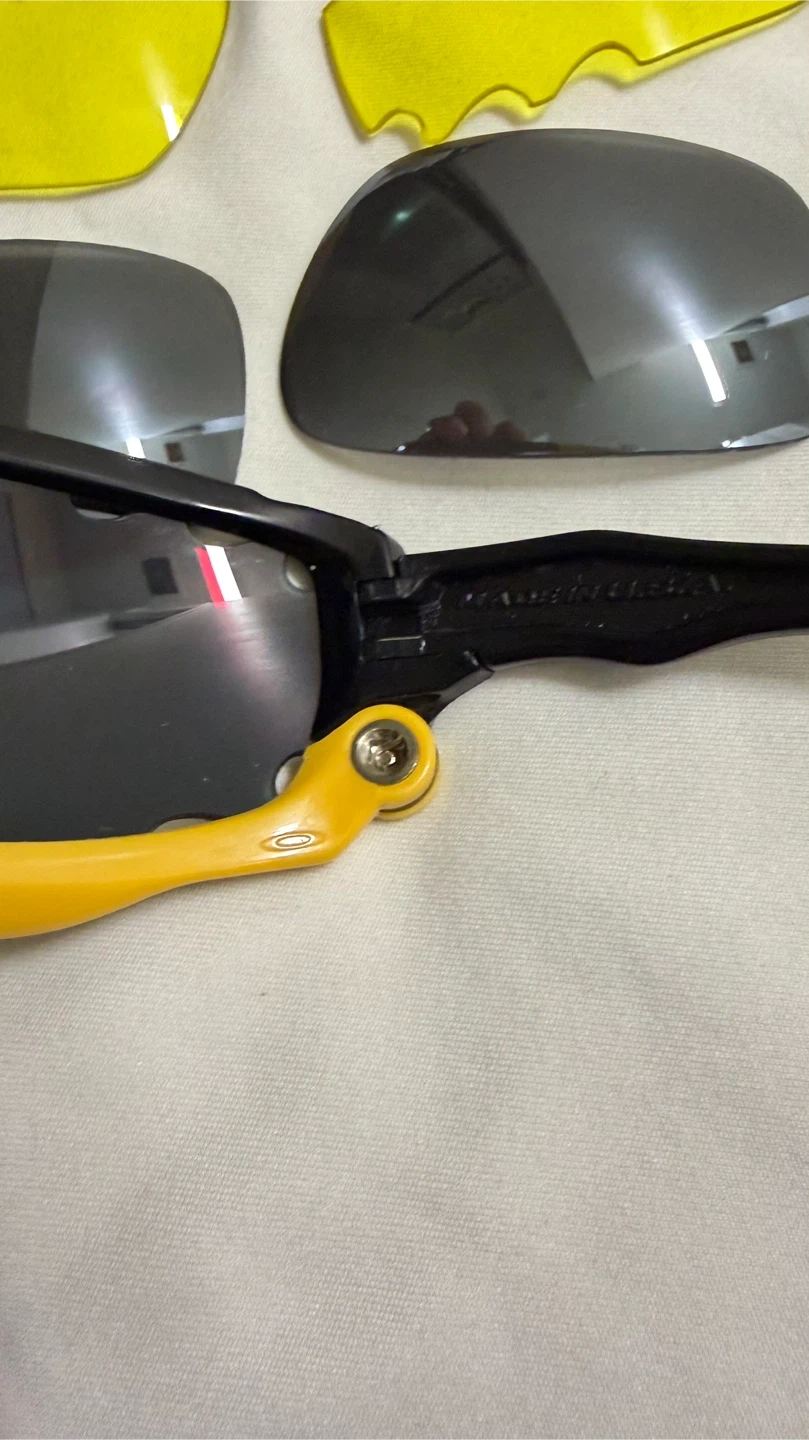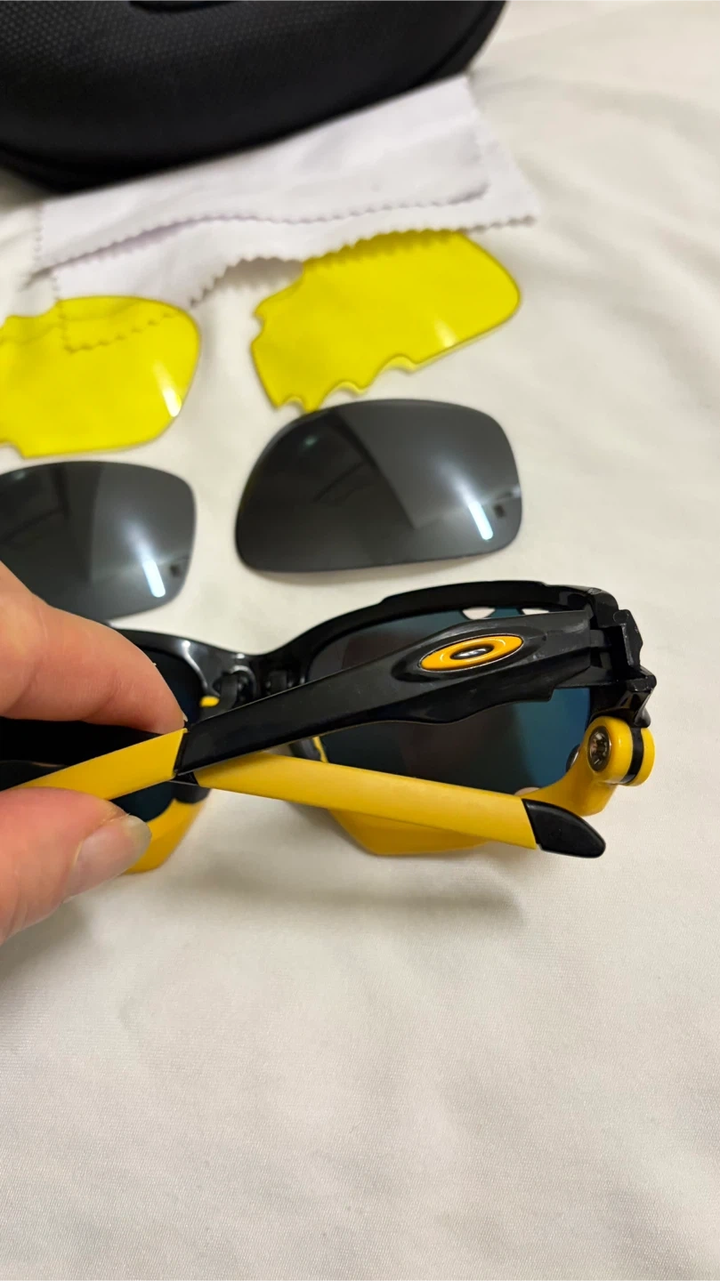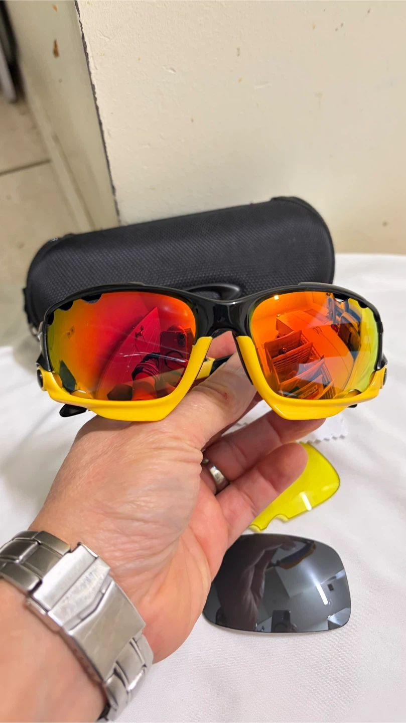 Selling a pair of Oakley Jawbone sunglasses. They come with a black case, a cleaning cloth, and two sets of extra lenses (yellow and grey). The sunglasses have a black and yellow frame.
