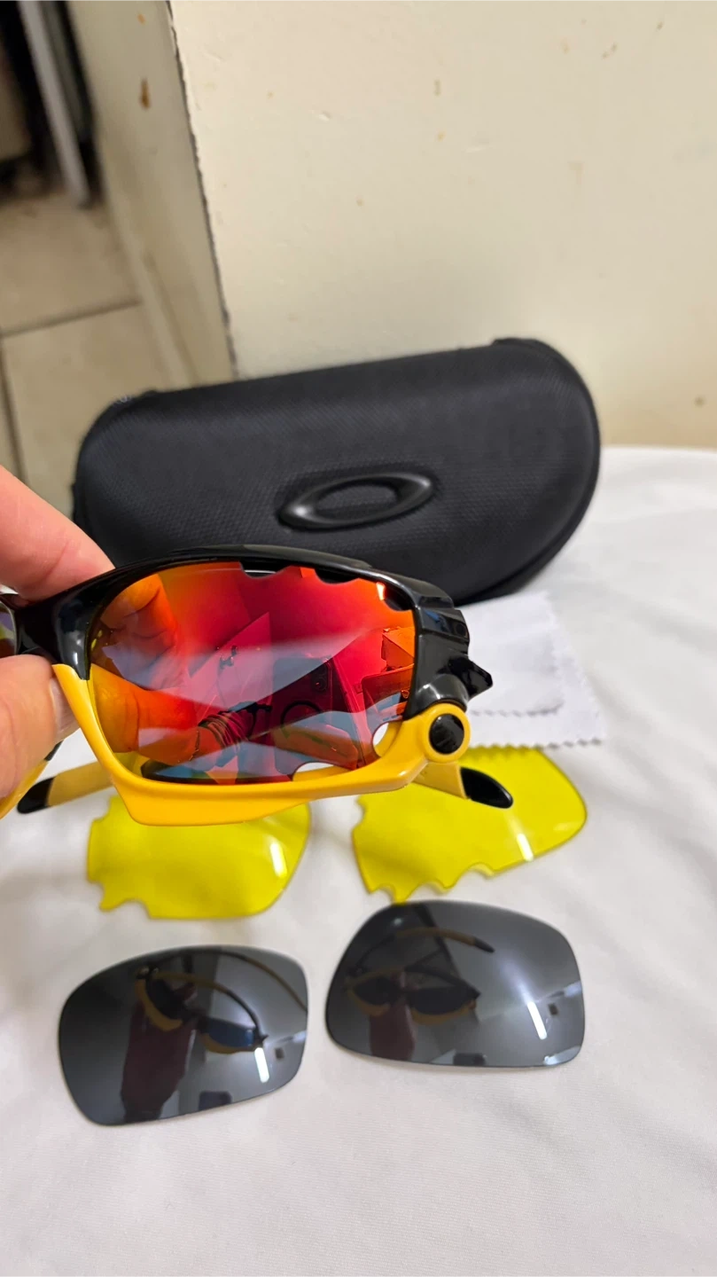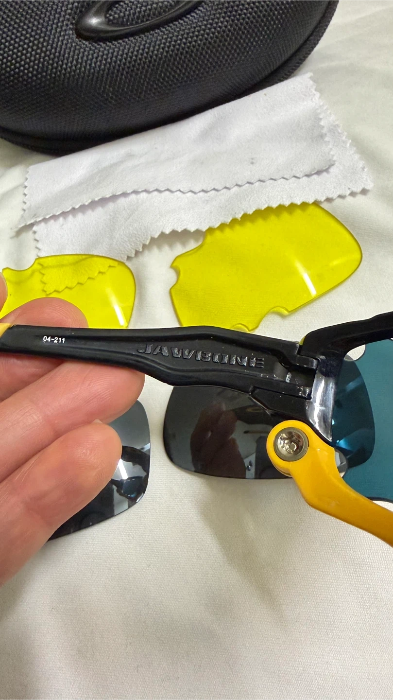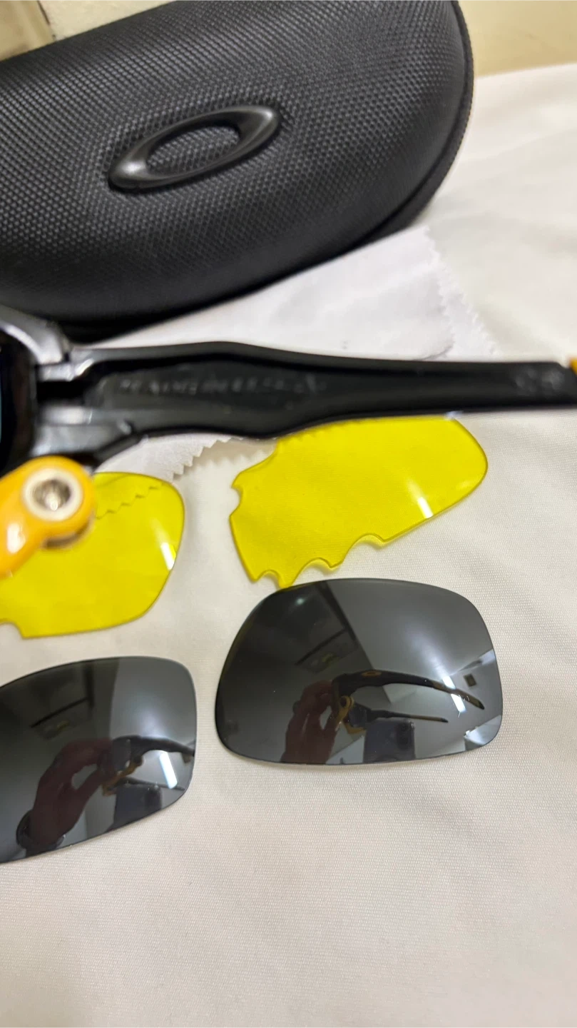 Selling a pair of Oakley Jawbone sunglasses. They come with a black case, a cleaning cloth, and two sets of extra lenses (yellow and grey). The sunglasses have a black and yellow frame.