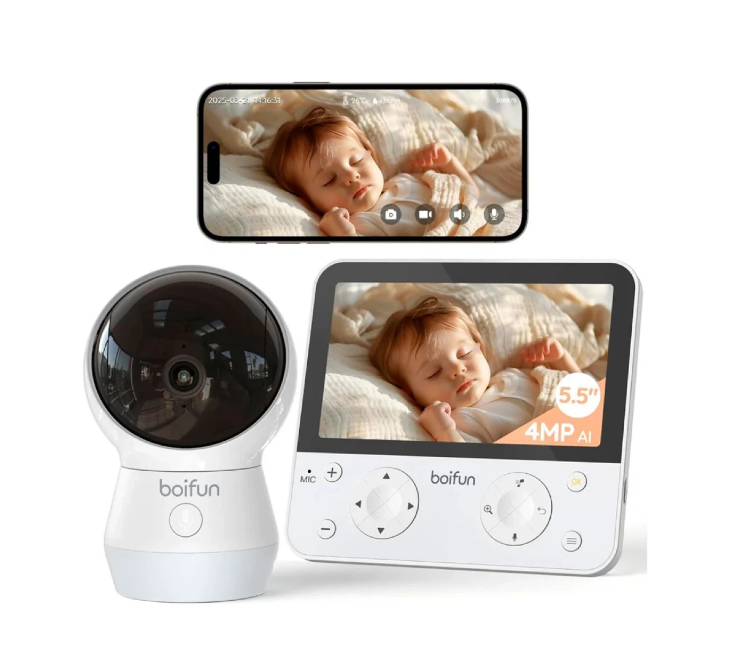Selling a brand new Boifun Baby 4TM 5.5" Smart Video Monitor! This smart video monitor is perfect for keeping an eye on your little one. It features a 5.5" screen and 4MP AI camera for clear visuals.