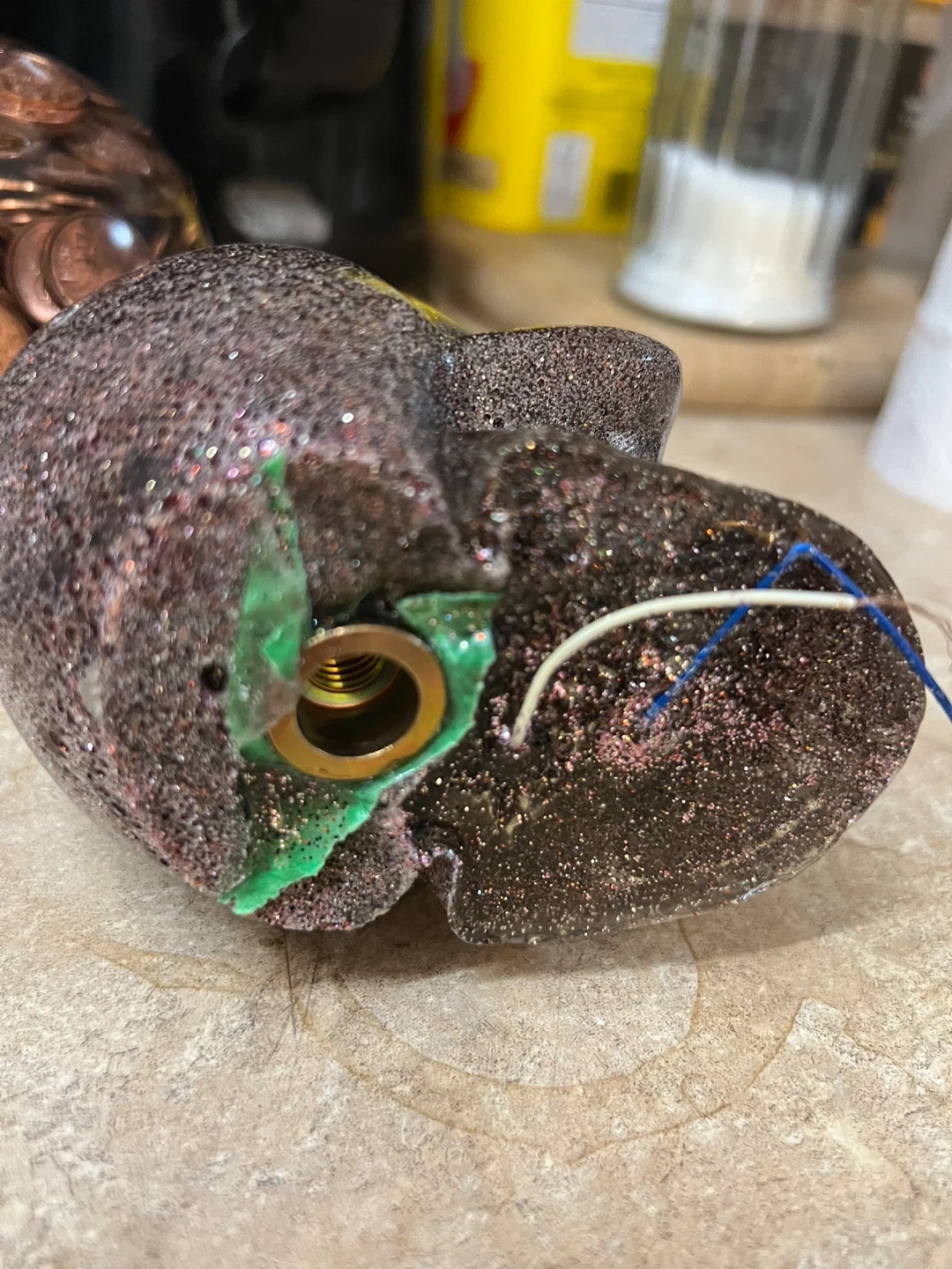 Here's a glittery skull decoration. It has a brown/black colour with lots of glitter. It would be a great addition to a Halloween display or just as a unique piece of decor it too has pennies inside and it’s like a time capsule, but this one’s filled with glitter, and it also has a light inside. It’s kind of more girly.