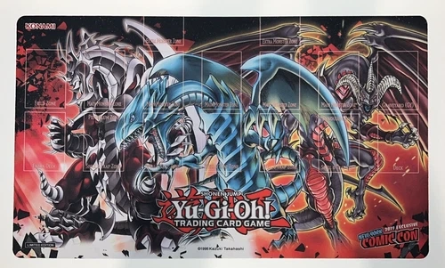 Game Mat features signature monsters wielded by the biggest rivals from Yu-Gi-Oh!’s first three series: Kaiba’s Blue-Eyes White Dragon, Chazz’s Armed Dragon LV10, and Jack Atlas’ Red Dragon Archfiend! Originally sold at KONAMI's Comic Con booth while supplies lasted.