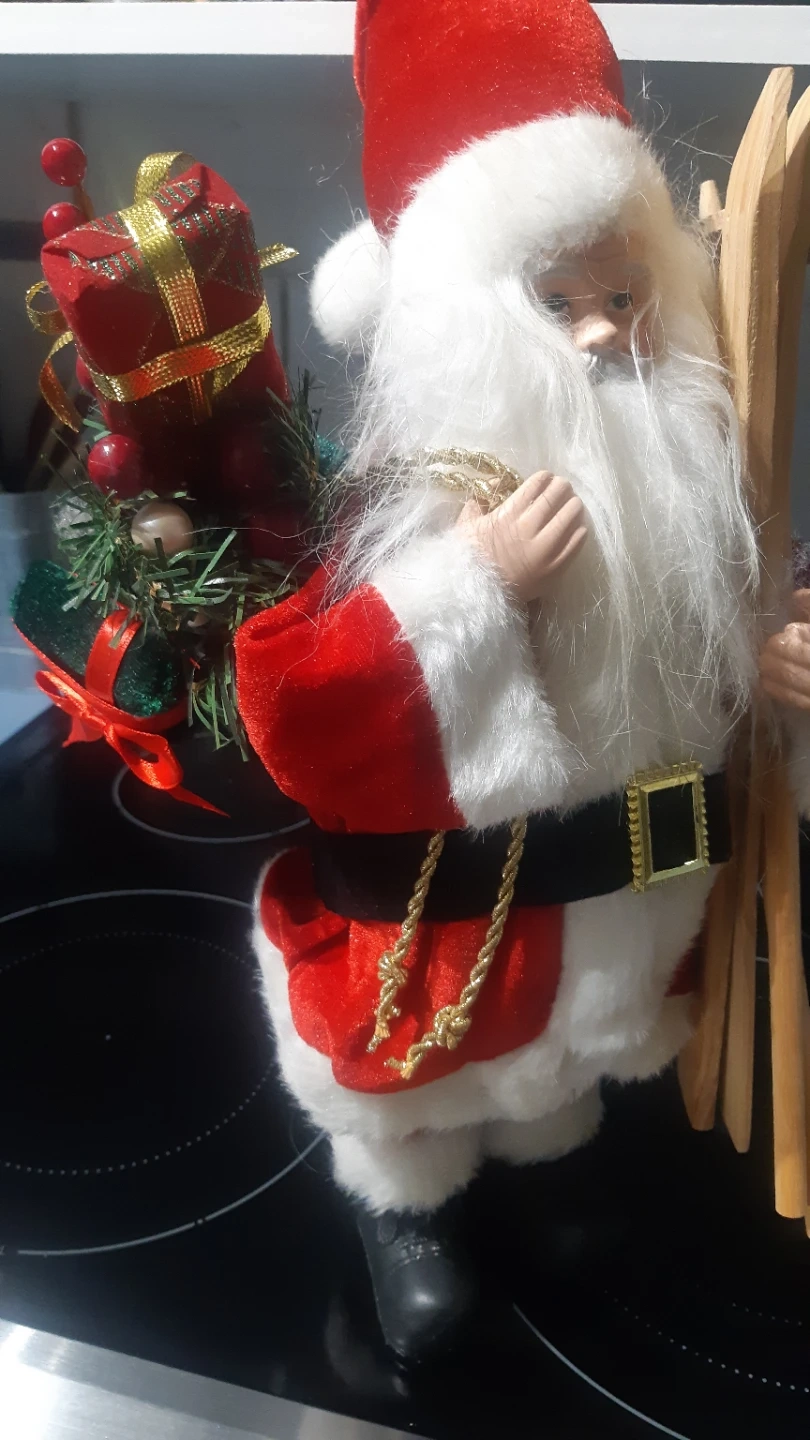 Here's a cute Santa Claus figurine, ready to bring some holiday cheer! He's wearing his classic red and white suit, complete with a belt and gold accents. He's also carrying a set of skis, ready for some winter fun!