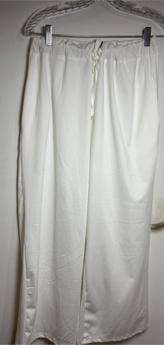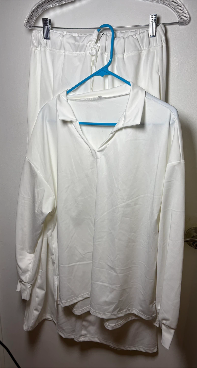 Selling a comfy white loungewear set! It's a size XL and perfect for relaxing at home or running errands. The material is soft and lightweight, making it great for warmer weather. The set includes a long-sleeved top and pants with a drawstring waist