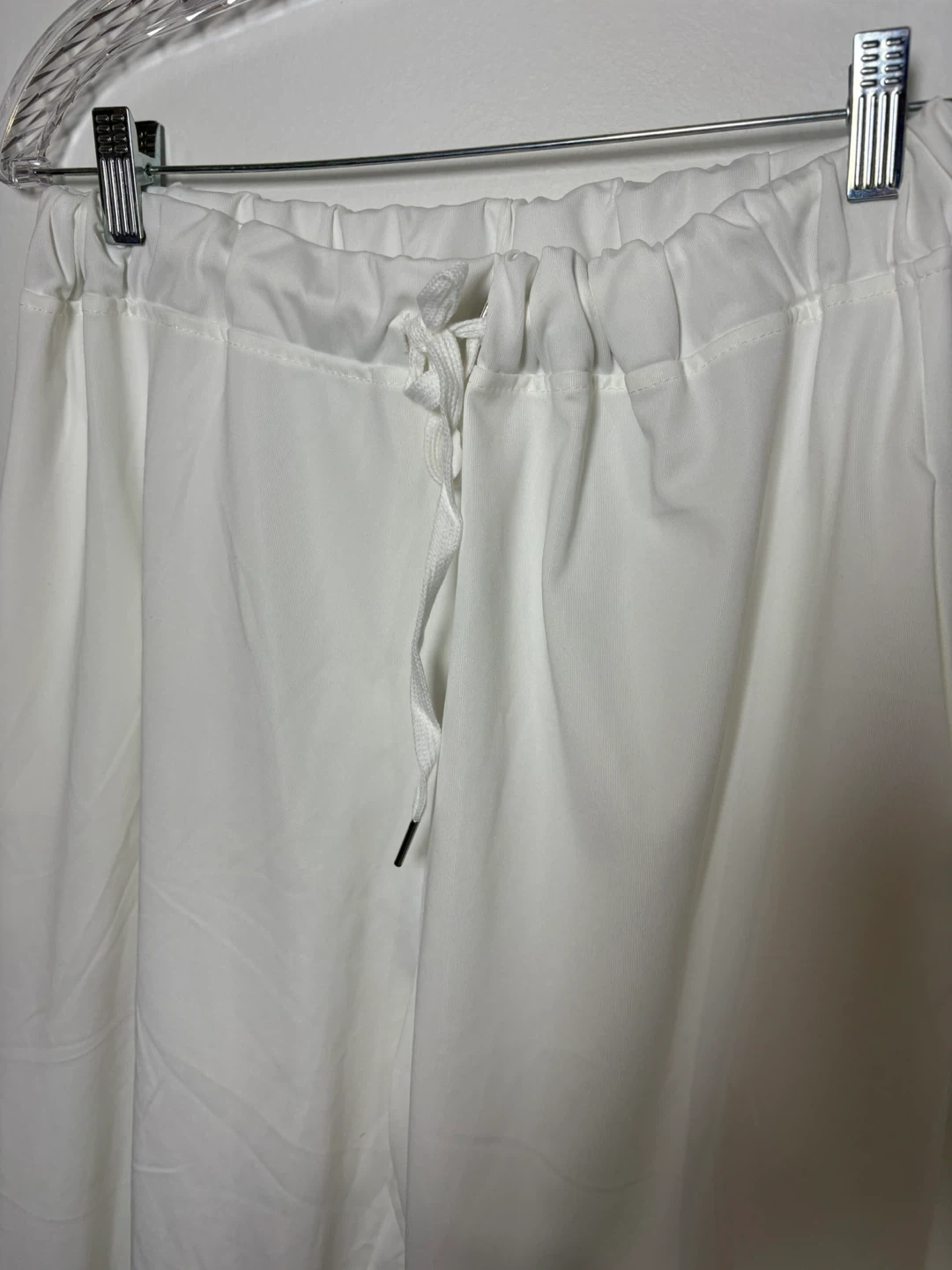 Selling a comfy white loungewear set! It's a size XL and perfect for relaxing at home or running errands. The material is soft and lightweight, making it great for warmer weather. The set includes a long-sleeved top and pants with a drawstring waist