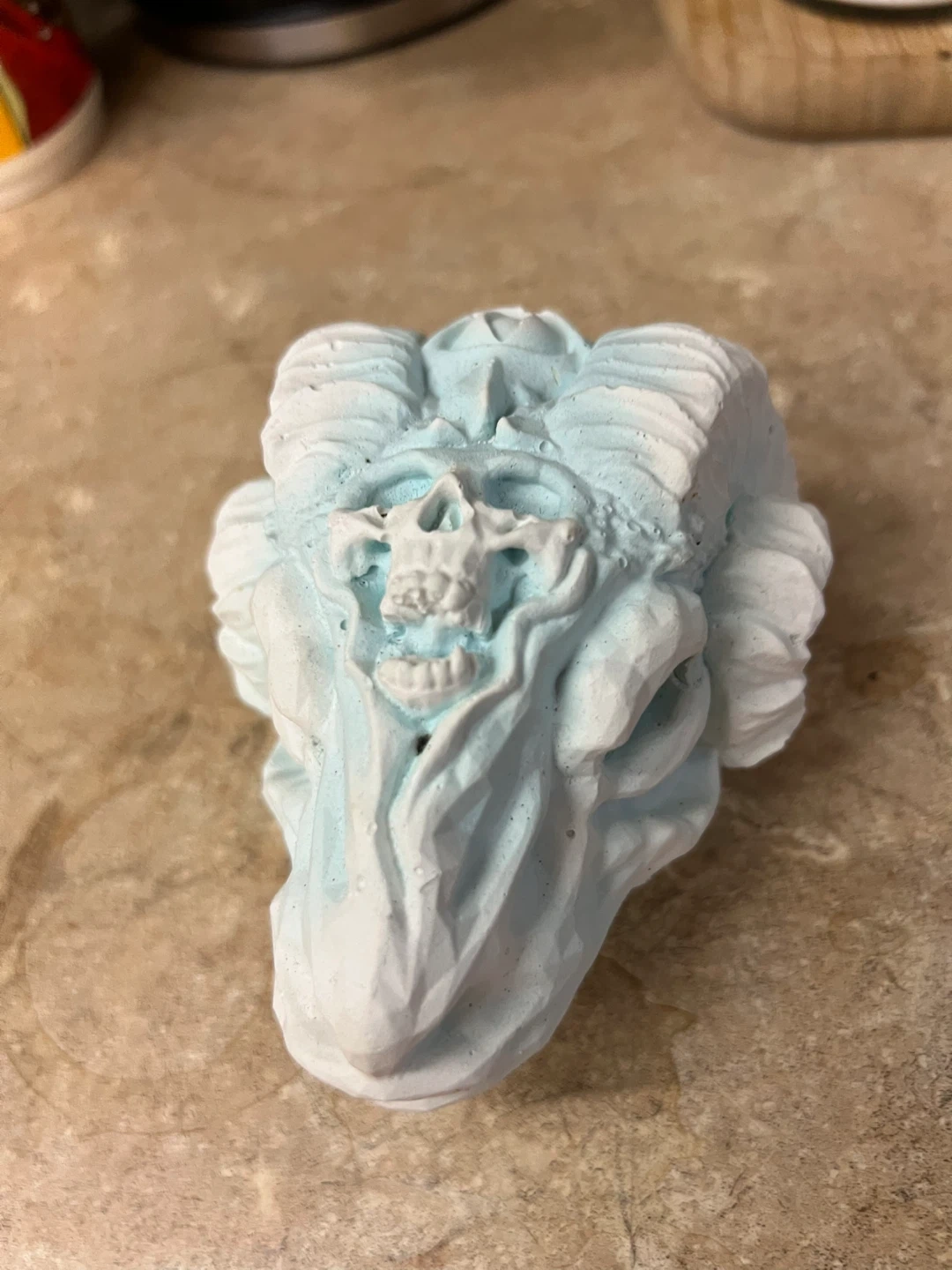 Here's a unique blue skull sculpture! It's a really interesting piece and would look great as a decorative item made from plaster decor they can also be used as chalk for writing on the pavement or the wall