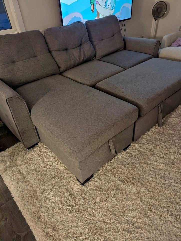 Mint condition. Like new. Chaise is reversible to either side. Just steam cleaned that's why one cushion looks different (still damp) Has a pull out bed, and chaise opens up for storage. Measures 7 foot 4 Inches by 5 feet No damages at all Smoke and pet free