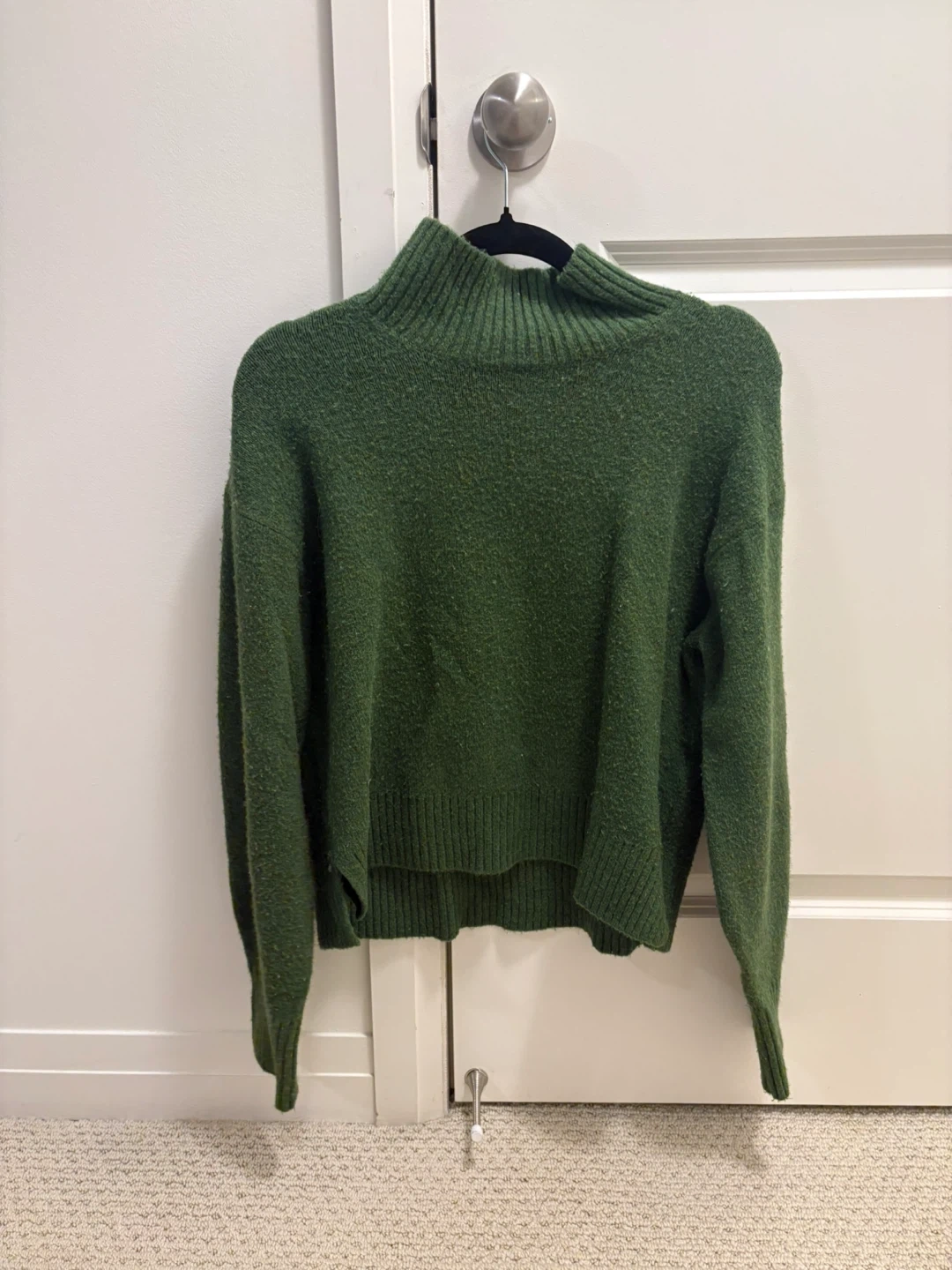 Cozy green sweater from Uniqlo! It's a size XS and made of a blend of acrylic, wool, nylon, and spandex.