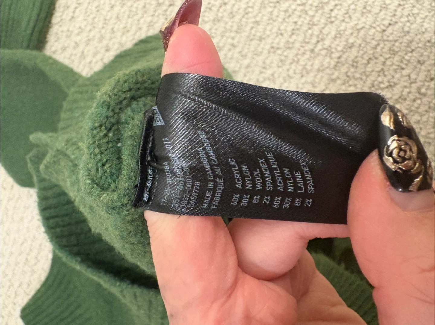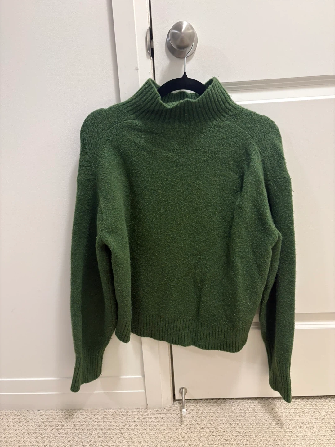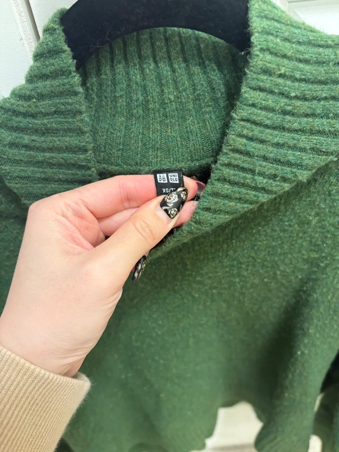 Cozy green sweater from Uniqlo! It's a size XS and made of a blend of acrylic, wool, nylon, and spandex.