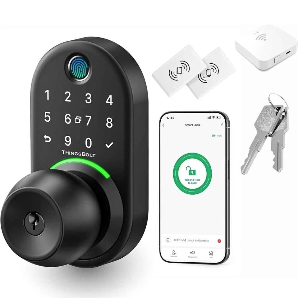 WiFi Smart Door Lock with Knob - THINGSBOLT Keyless Fingerprint Entry, Bluetooth & App Control, Alexa Compatible, Keypad and Mechanical Key Access, WiFi Gateway Included - Black