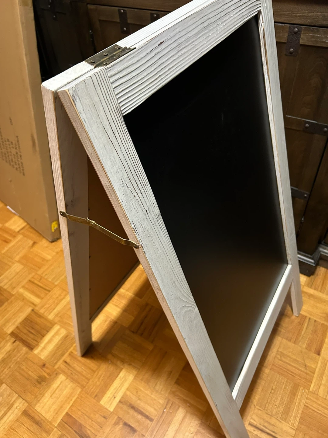 Its double-sided design allows you to display different messages or promotions on both fronts, making it perfect for maximum visibility. Crafted from sturdy 100% Paulownia Wood , this sandwich board features a reinforced heavy-duty hinge that is wind-resistant, ensuring reliable performance for both indoor and outdoor use. Easy to Clean & Convenient: The chalk board surface is smooth and easy to wipe clean with slightly damp cloth, allowing for effortless updates to your messages. It also folds flat for easy storage and portability.