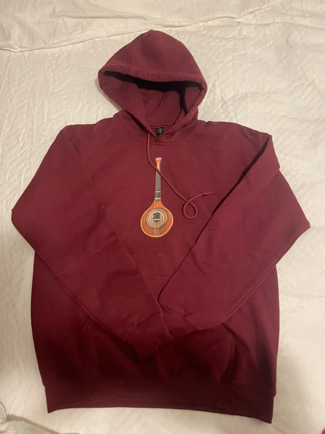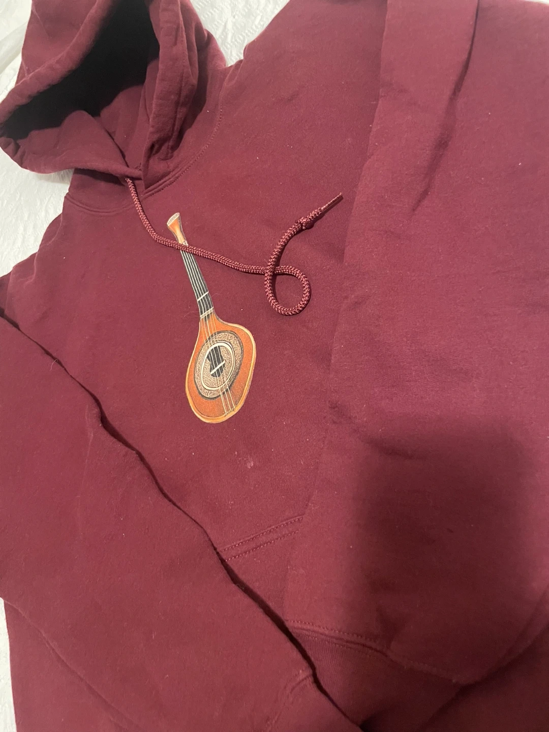 A cozy burgundy hoodie featuring a unique lute design on the front. It's in great condition and perfect for adding a touch of musical flair to your wardrobe!
