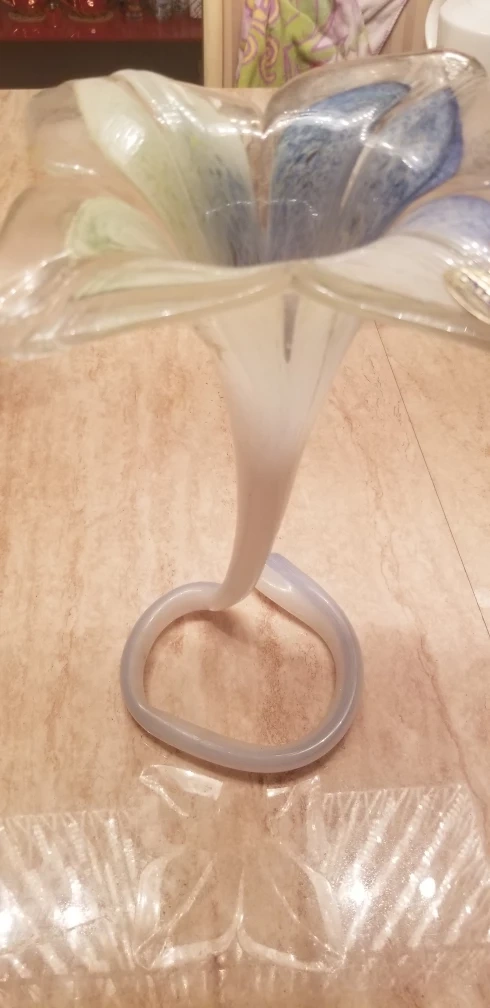 Beautiful Murano art glass flower vase with a unique design! It features a clear glass flower with blue and green accents, and a twisted stem. A lovely piece to add to your home decor