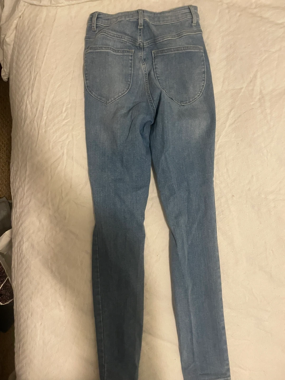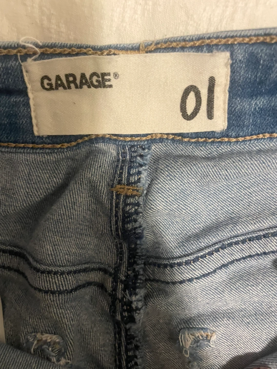 Selling a pair of Garage jeans in a light wash denim. They feature trendy distressed details at the knees. Size 01