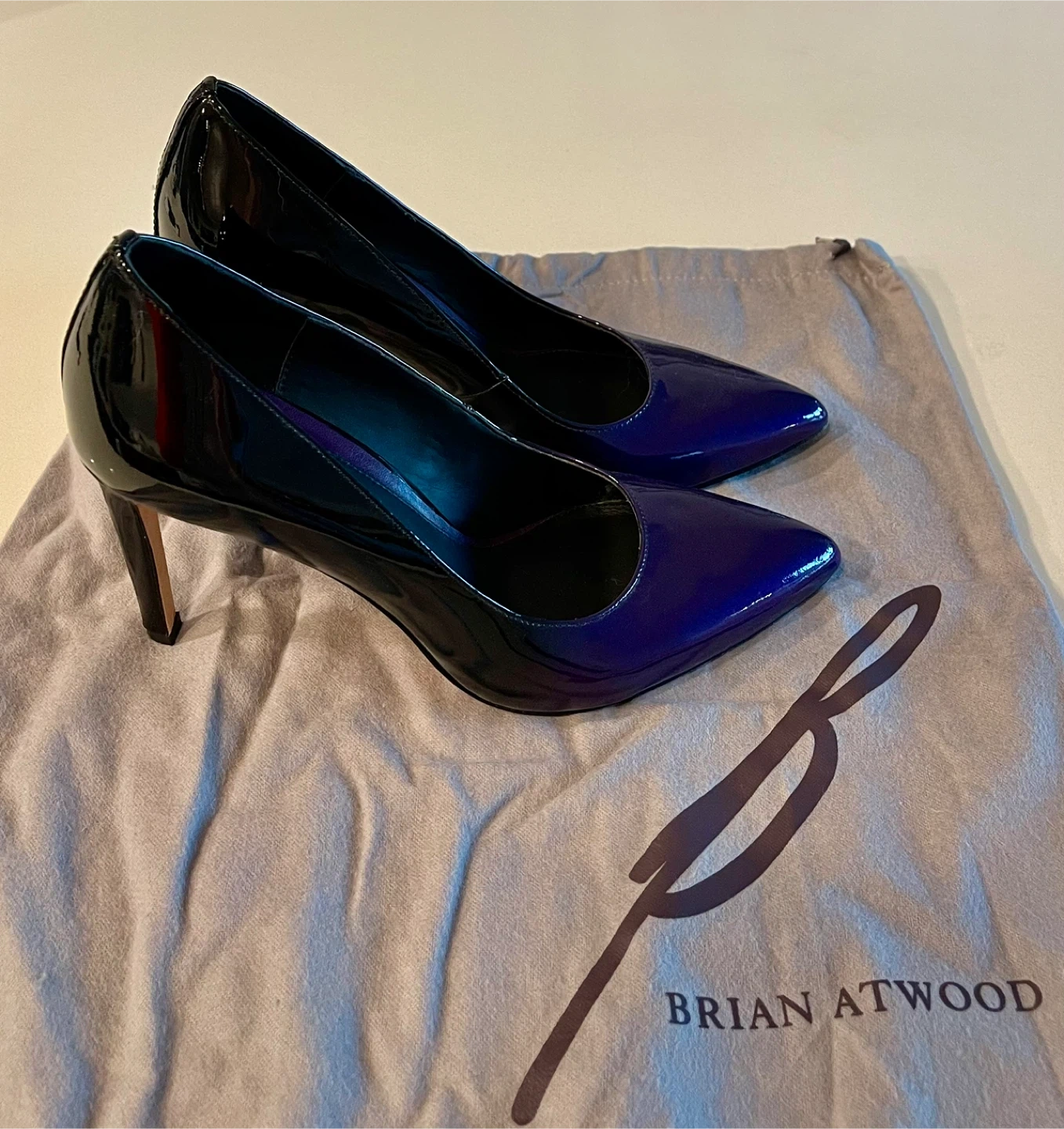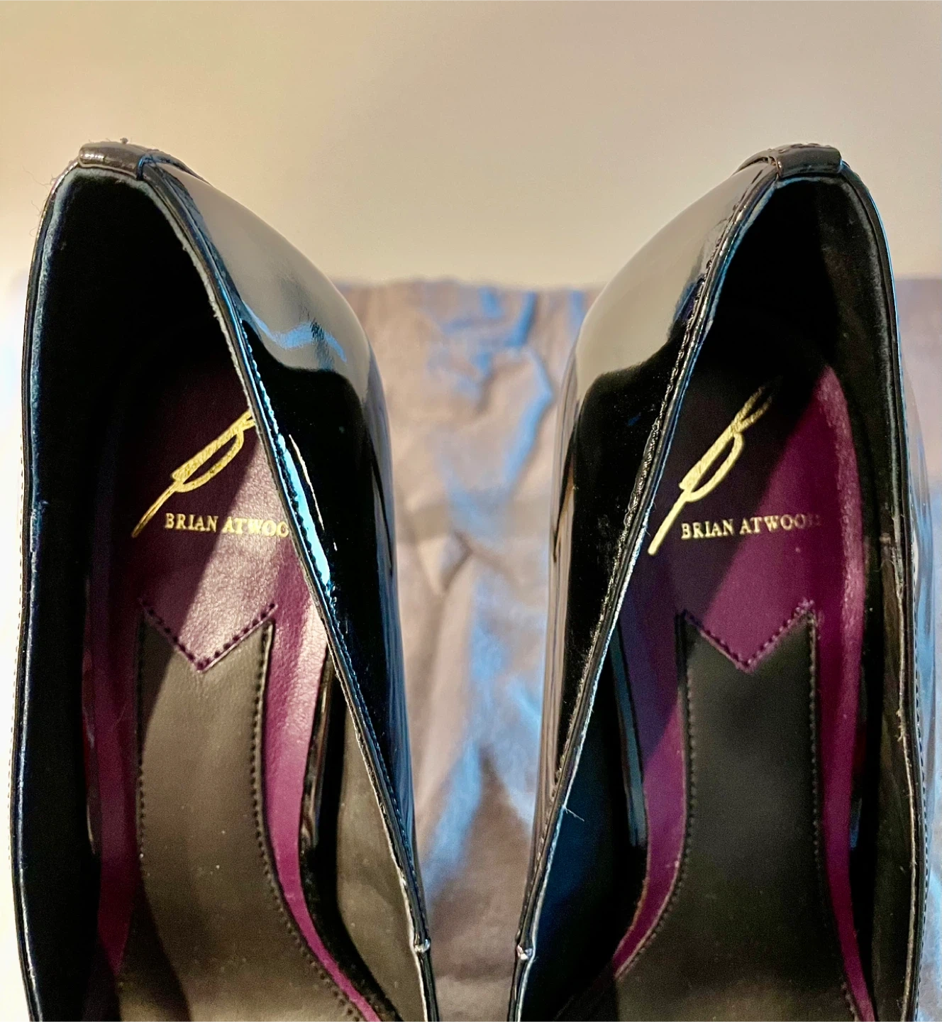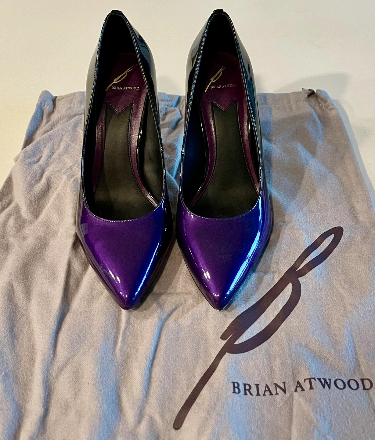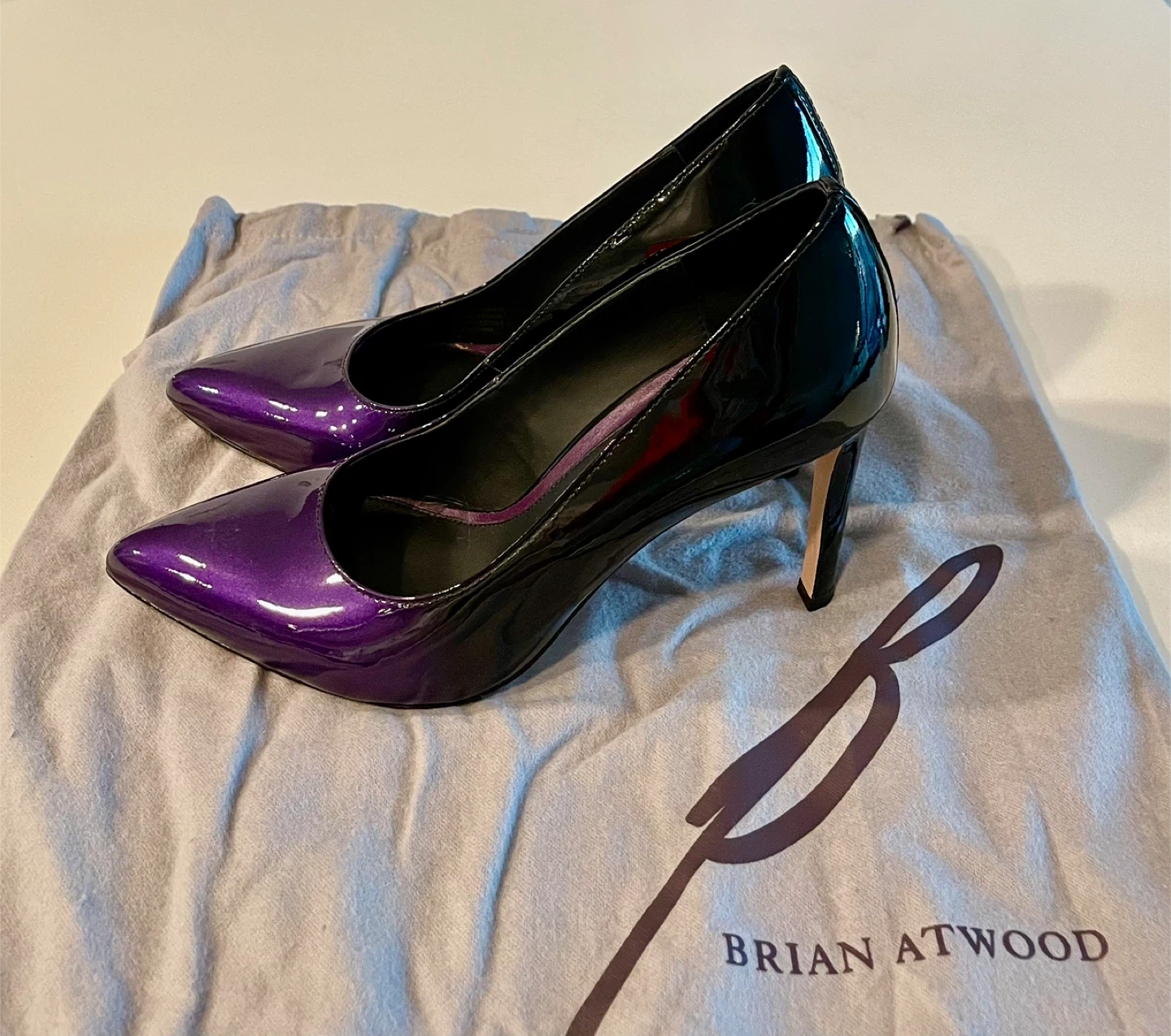 Selling a pair of Brian Atwood heels! They're a beautiful combination of purple and black patent leather. Comes with the original dust bag.