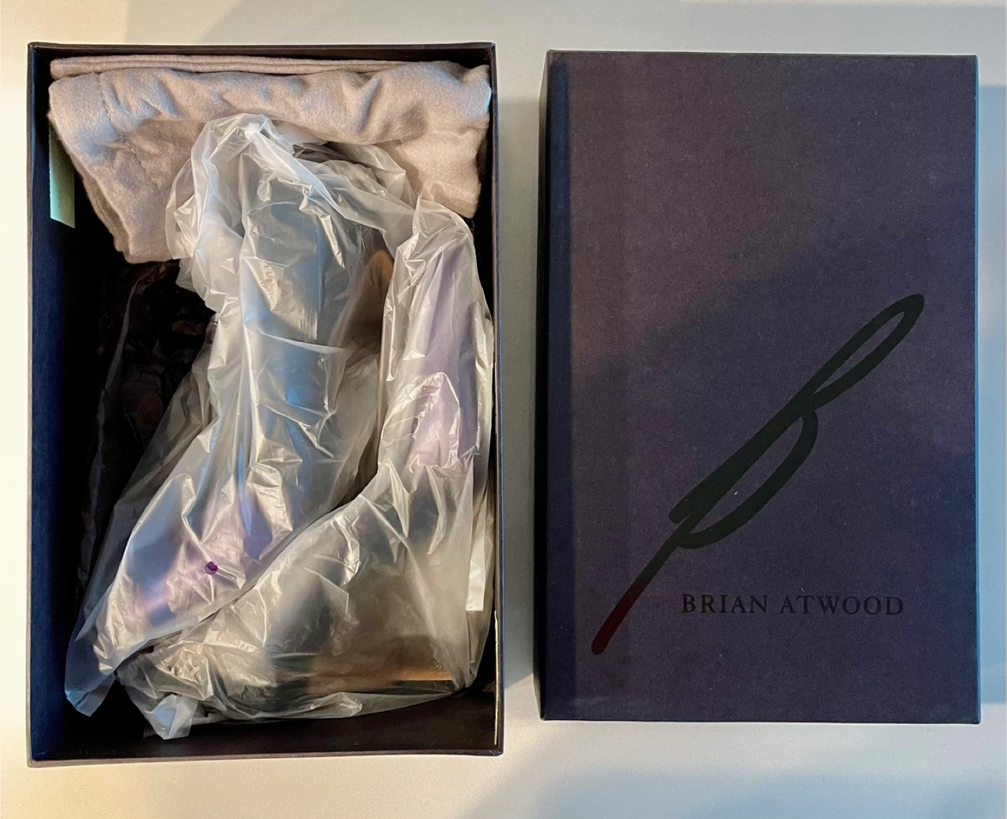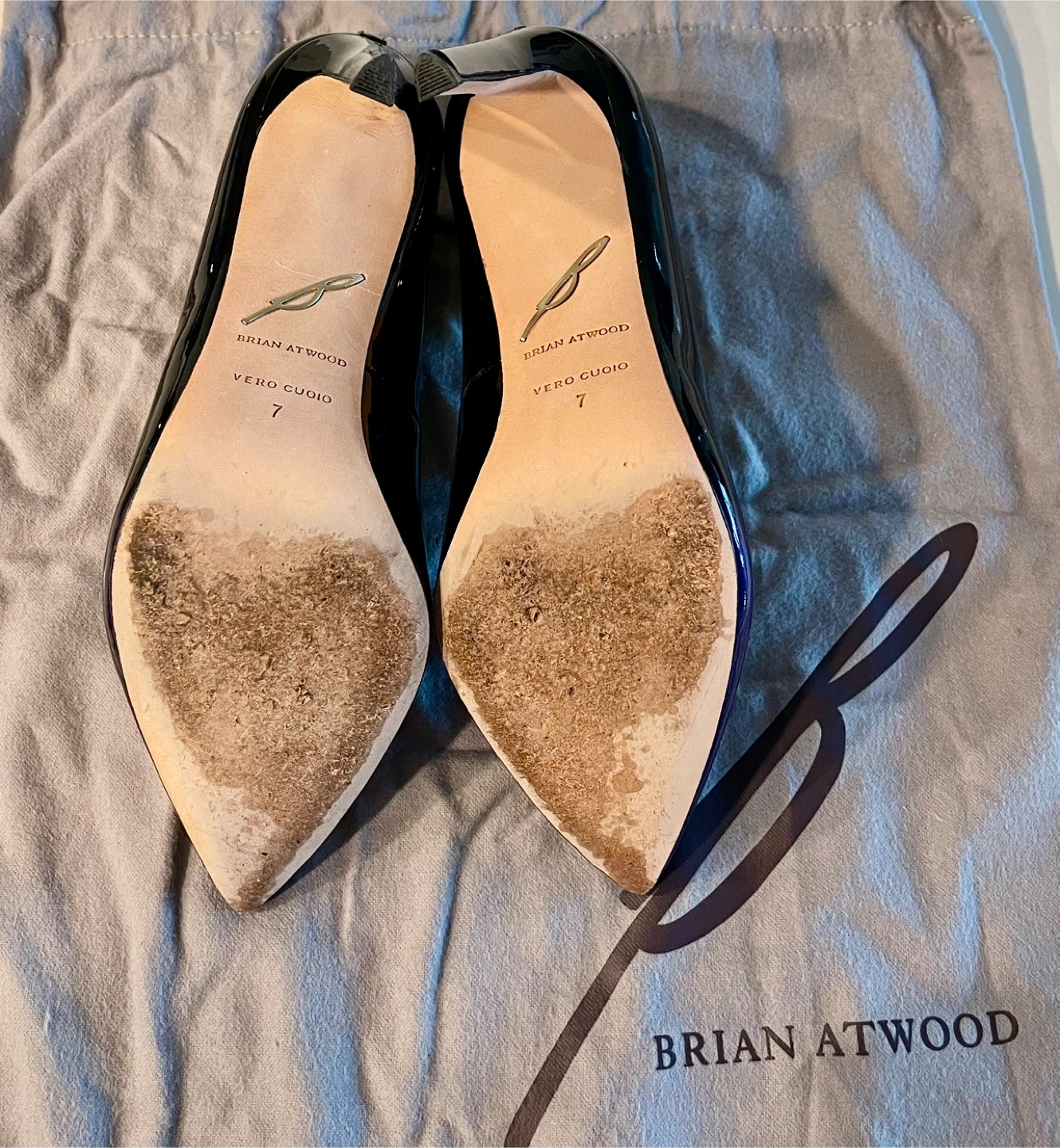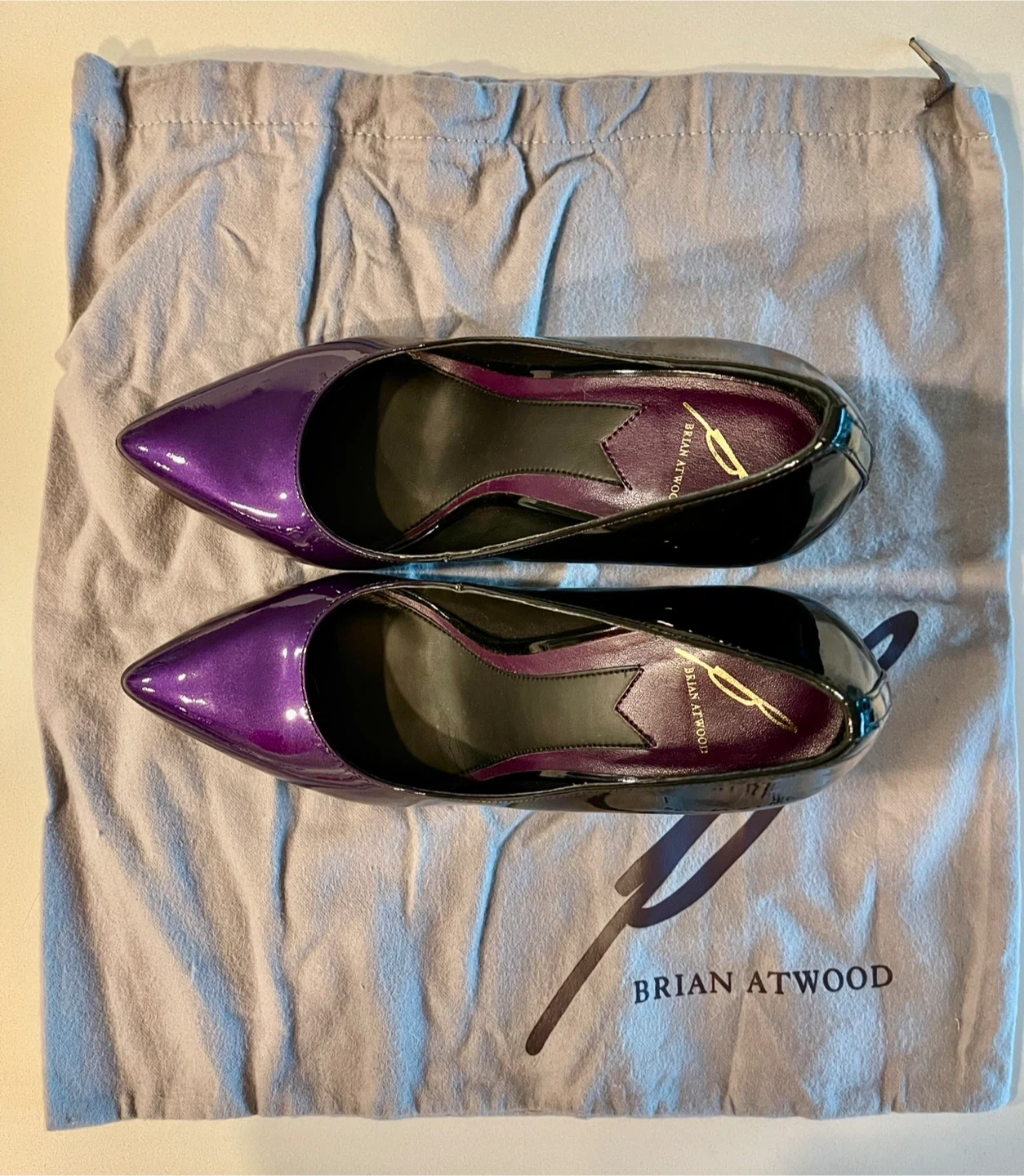 Selling a pair of Brian Atwood heels! They're a beautiful combination of purple and black patent leather. Comes with the original dust bag.