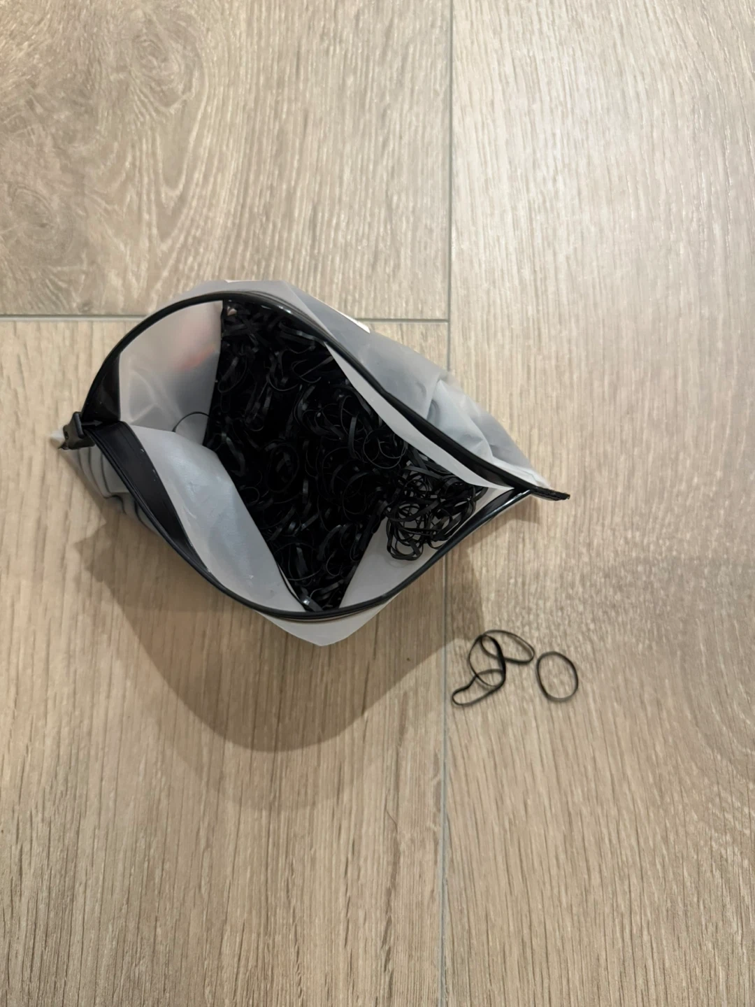 A bag of black hair ties, perfect for keeping your hair up or styling different looks! They are elastic ponytail holders, so they're gentle on your hair