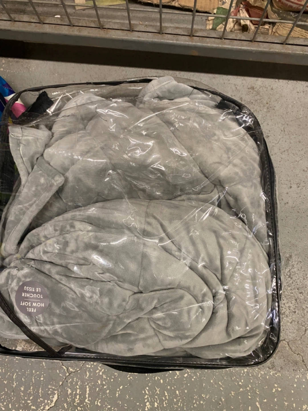 Here's a Feel How Soft weighted blanket still in its packaging. It comes in a reusable storage bag, making it easy to transport or store when not in use. The blanket is designed to provide a comforting, gentle pressure, helping to promote relaxation and improve sleep quality