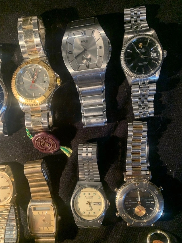 I'm offering a diverse collection of high-quality timepieces from various brands and prices. These watches come in mixed conditions. Please see photos for exact condition. Take a look and see if any strike your fancy! Rolex and Omega look like replicas. We can open them up and decide. Prices vary depending on the watch. Let me know if you're interested!