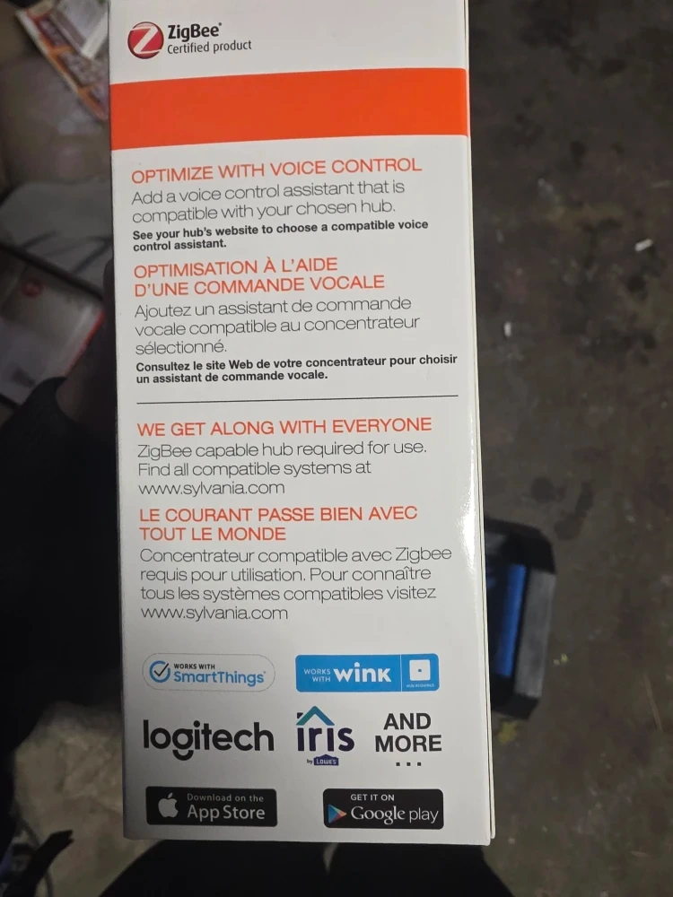 It's compatible with ZigBee and works with SmartThings, Wink, Logitech, and Iris. Please note that a hub is required/concentrateur requis.