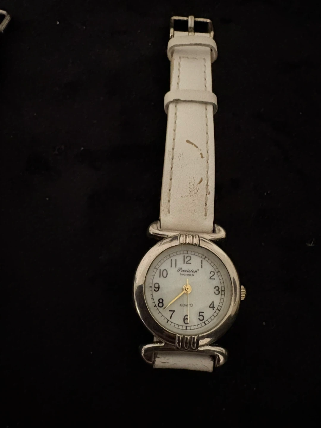 Selling a Precision Quartz watch with a white leather band. It shows some signs of wear on the band, as pictured. It's a stylish timepiece that would be a great addition to your collection!