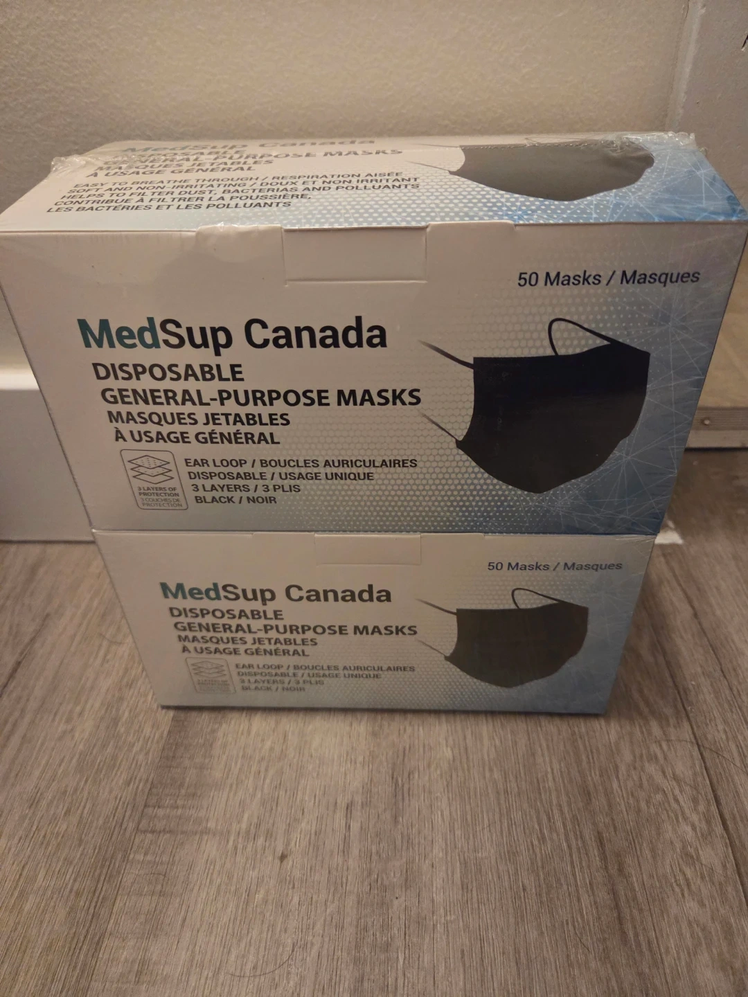 Selling a set of MedSup Canada disposable general-purpose masks. The box contains 50 black masks each. They have an ear loop design and are made of 3 layers for protection. Easy to breathe through and soft and non-irritating!