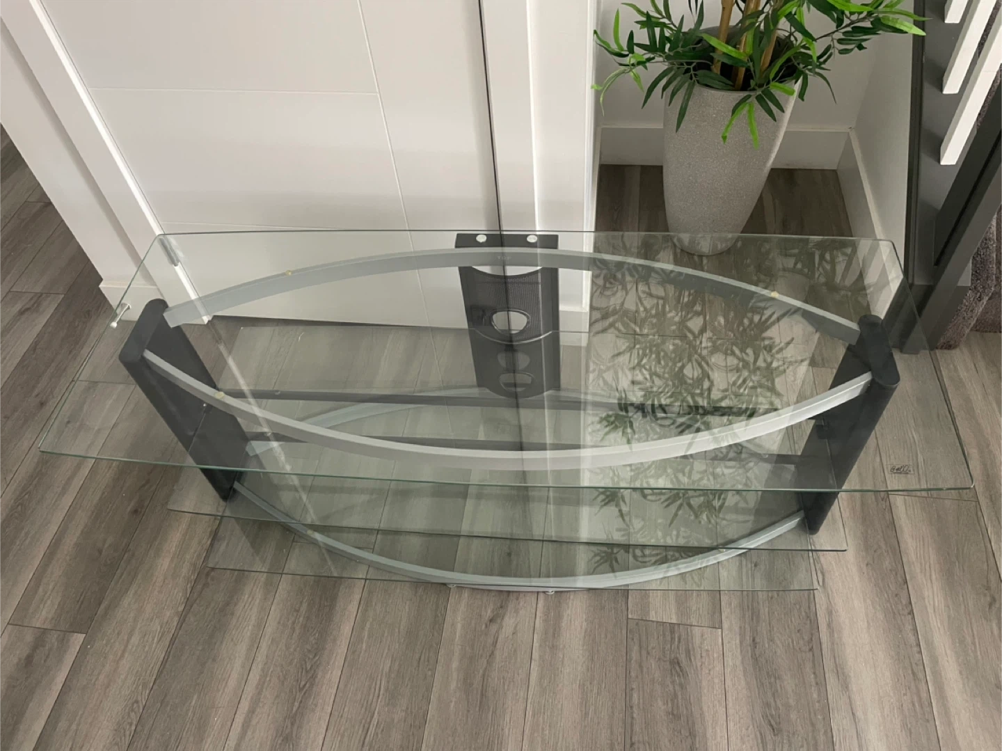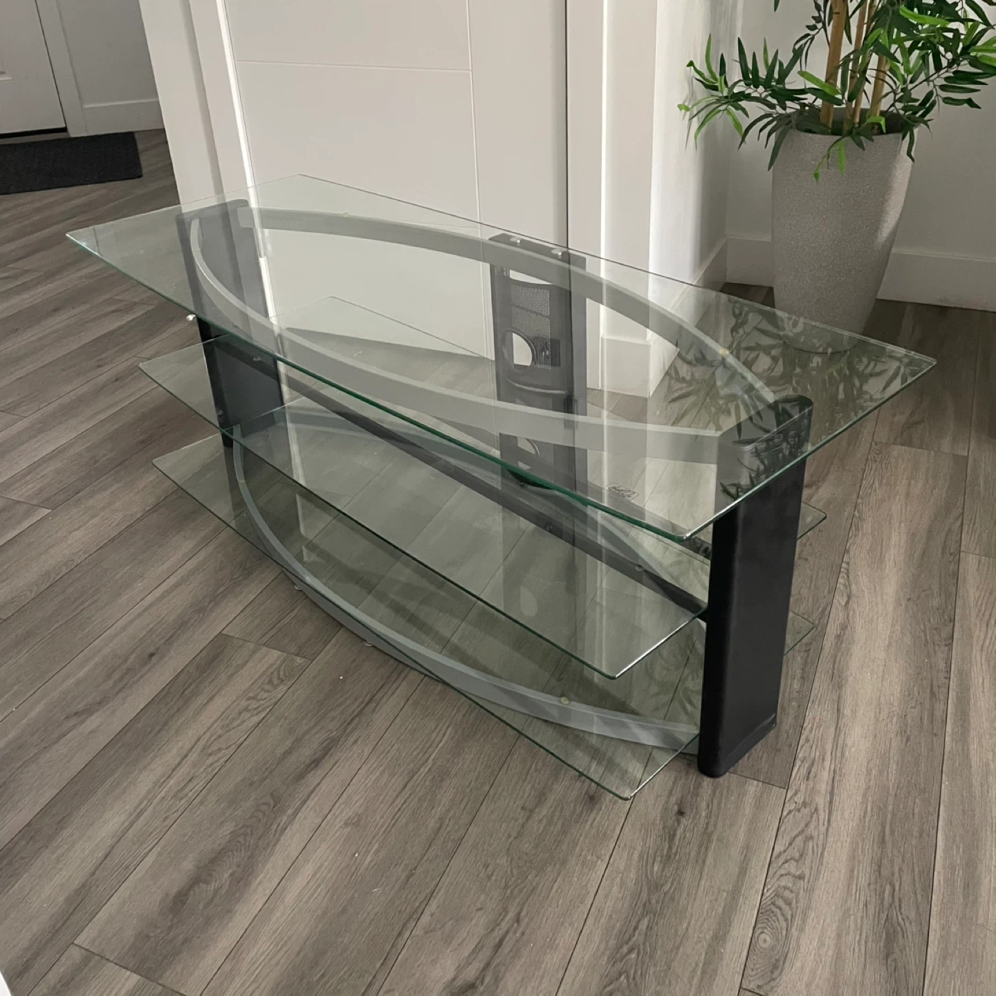 Glass TV Stand with Multiple Shelves. It's In Good Shape And Perfect For Organizing Your Media Devices. Can Provide Measurements If Needed (Fits A 70" TV).