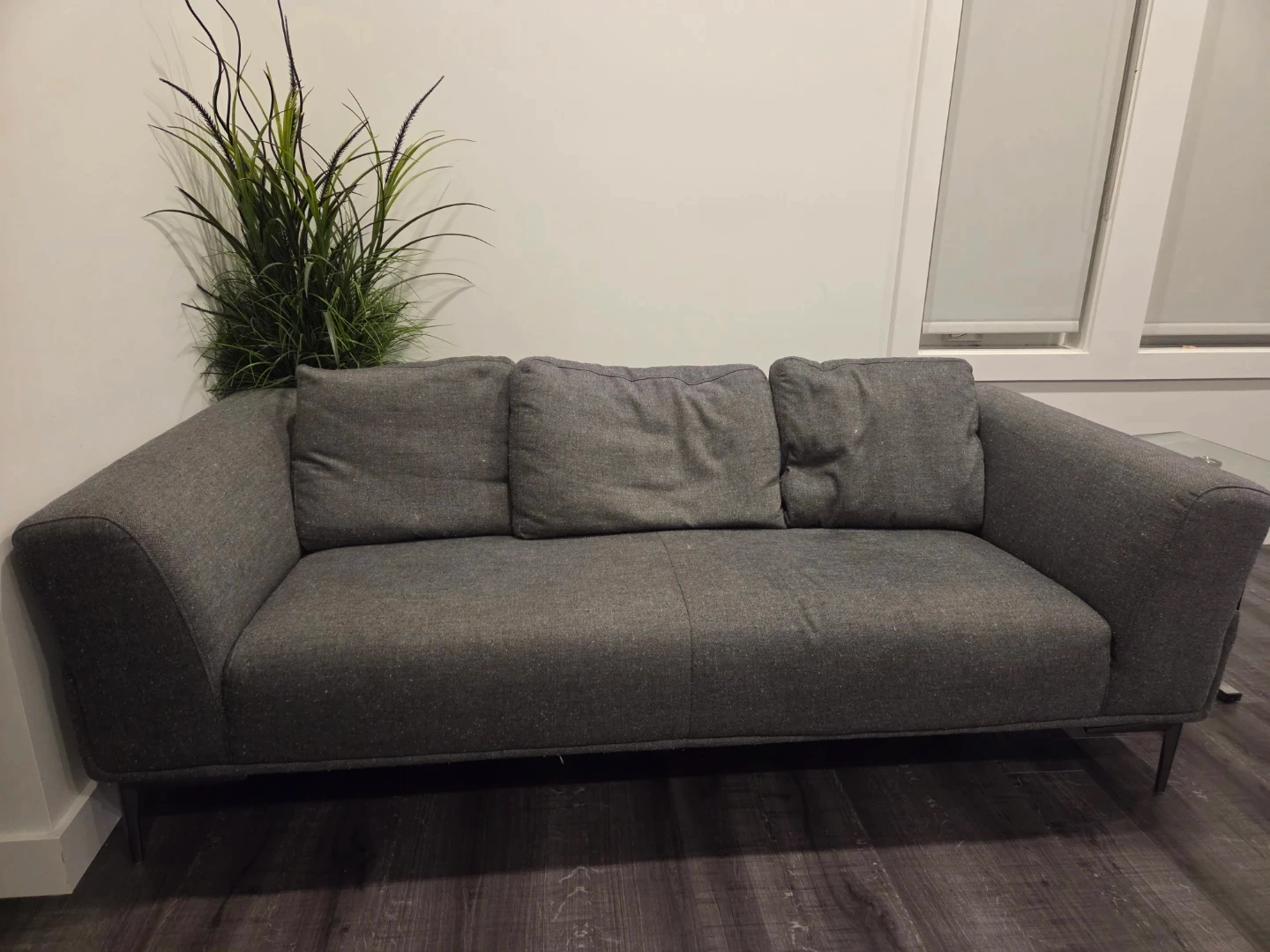 Selling a comfy grey sofa from "F2 Furnishing". It's in great condition and would be perfect for a living room or den. The fabric is a nice neutral grey that would fit in with any decor. It's a great piece!