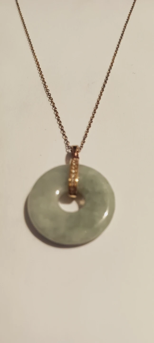 NEW !! 18K Gold Overlay Sterling Silver 925 Genuine Jade Pendant with Sterling Silver Chain Necklace. The pendant is a light green jade stone, and the chain is gold over Sterling Silver. It's a beautiful and unique piece of jewelry! NEW !! 18" long. ALL MY PRICES ARE NEGOTIABLE !!