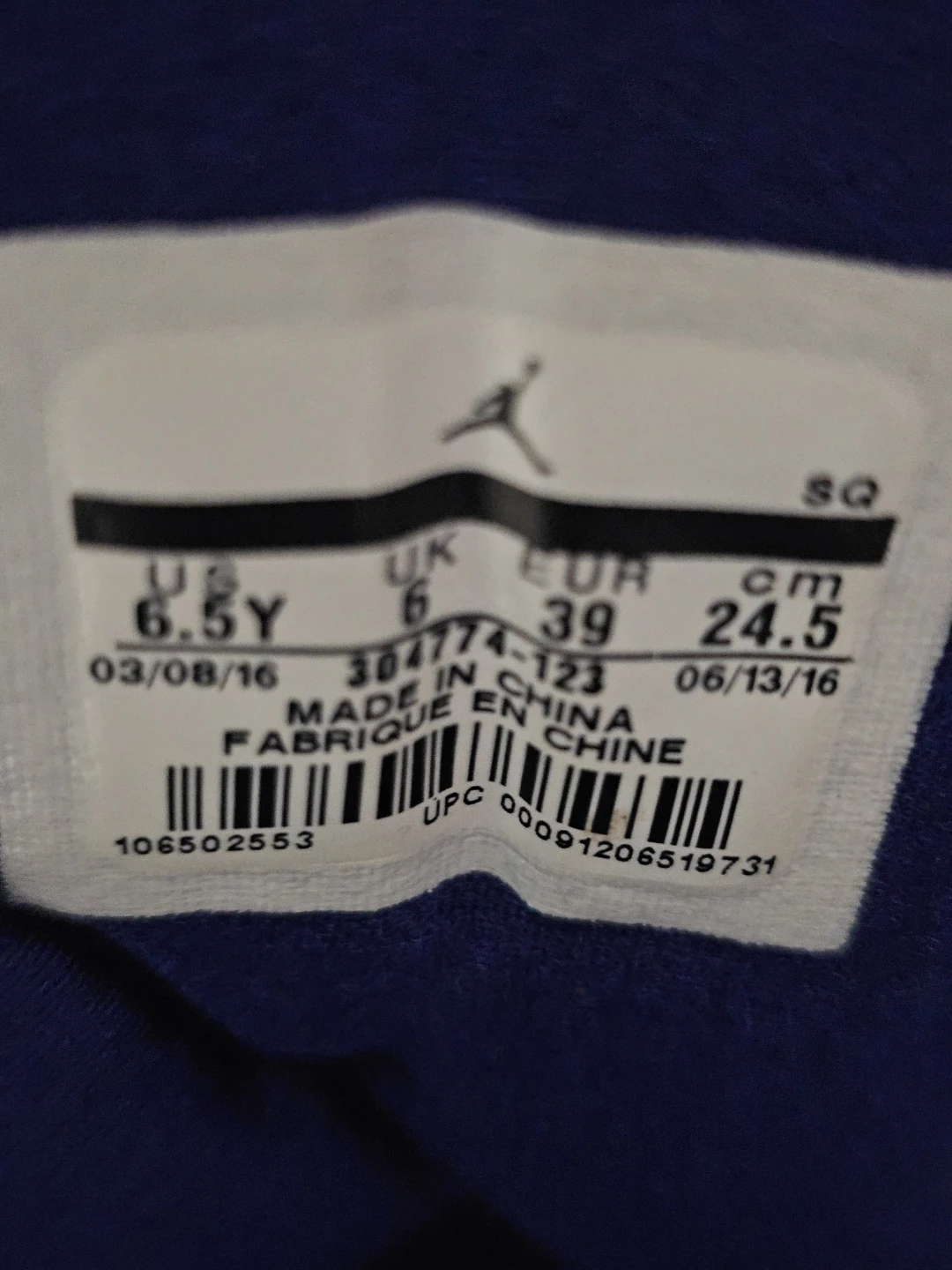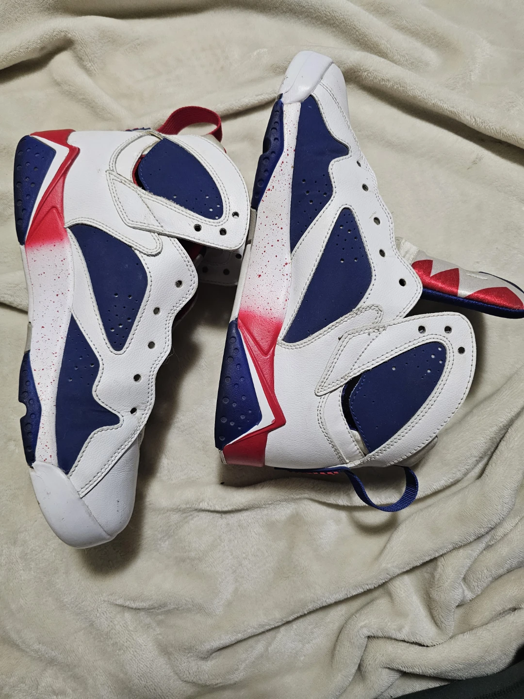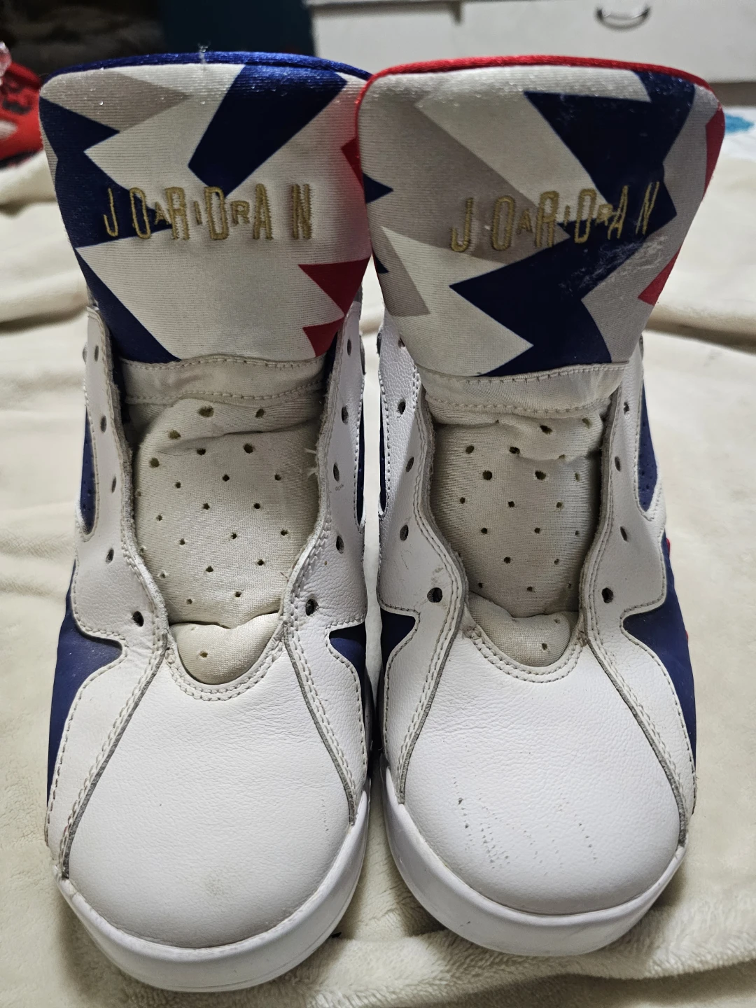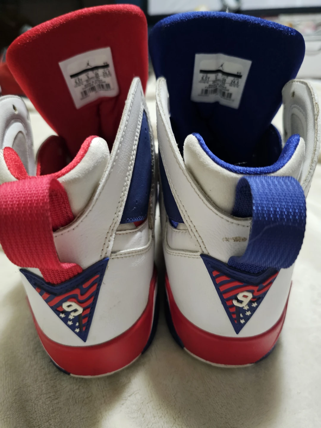 Selling a pair of Nike Air Jordan 7 Retro Olympic sneakers in size 6.5Y. They feature a white, red, and blue colour scheme. They are like new.