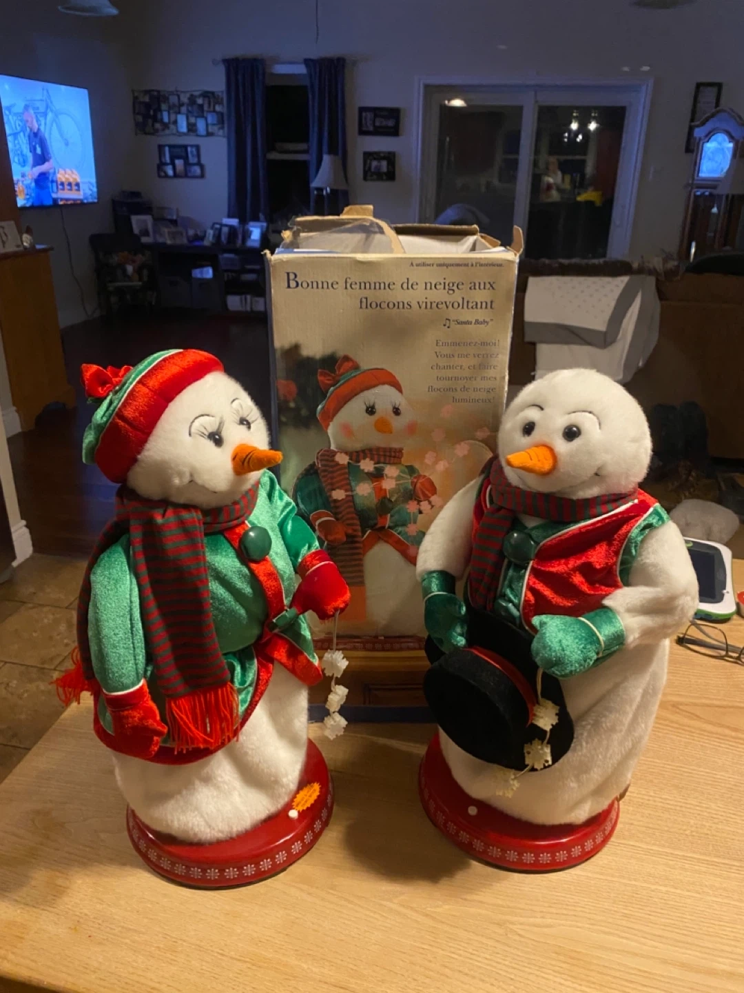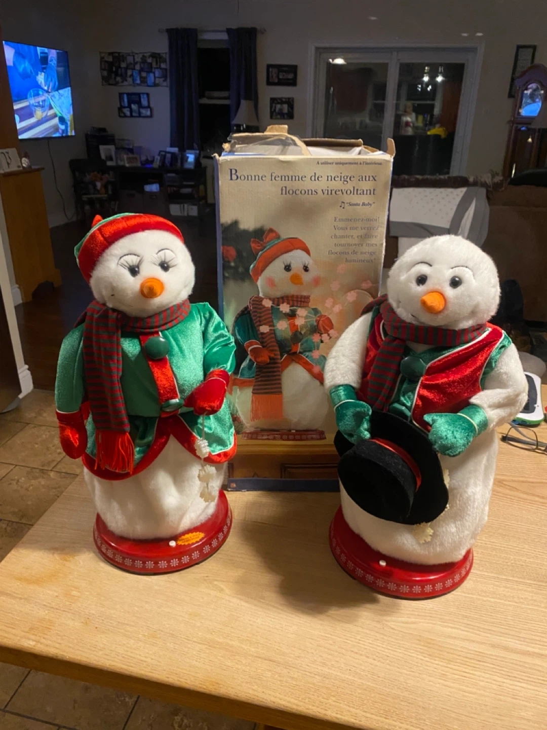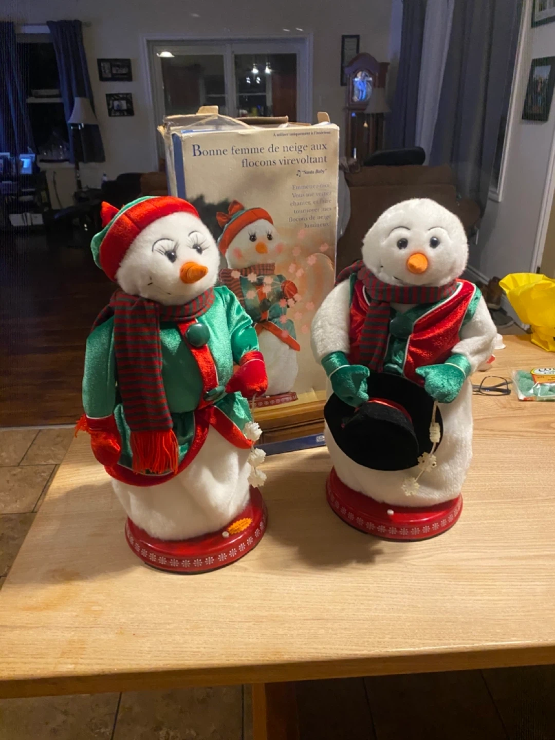 These vintage animated singing snow people will bring some holiday cheer to your home! They are in great condition and come with the original box for Mrs. Perfect for decorating your home for the holidays. 80.00 each or two for 150.00 pick up Port Elmsley