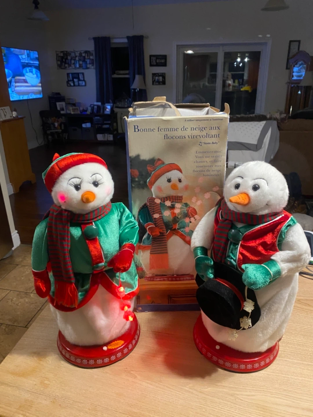 These vintage animated singing snow people will bring some holiday cheer to your home! They are in great condition and come with the original box for Mrs. Perfect for decorating your home for the holidays. 80.00 each or two for 150.00 pick up Port Elmsley