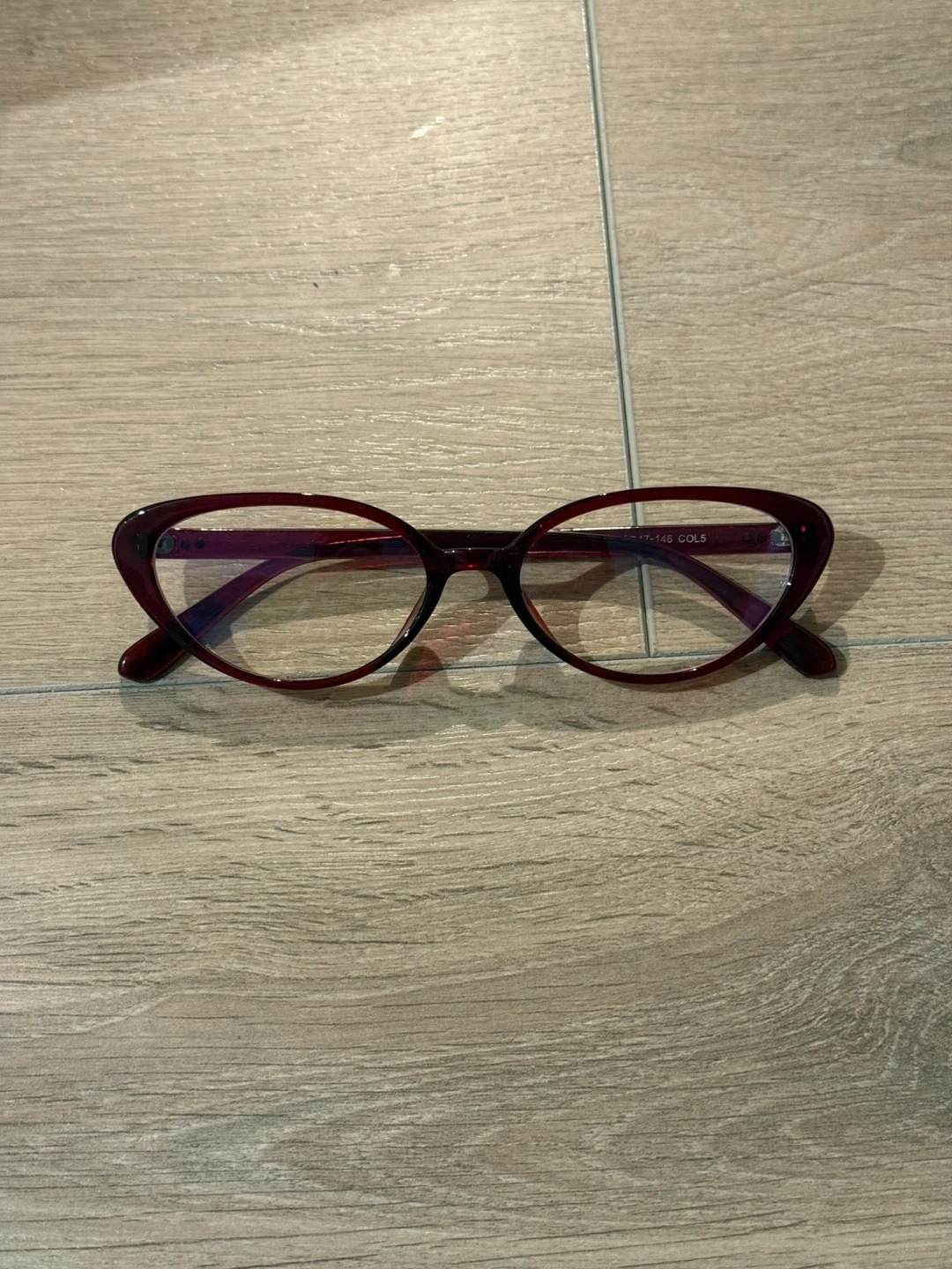 Selling a pair of burgundy coloured eyeglasses. They are in great condition and ready for a new owner! Only bought for a photo shoot selling since im a student.