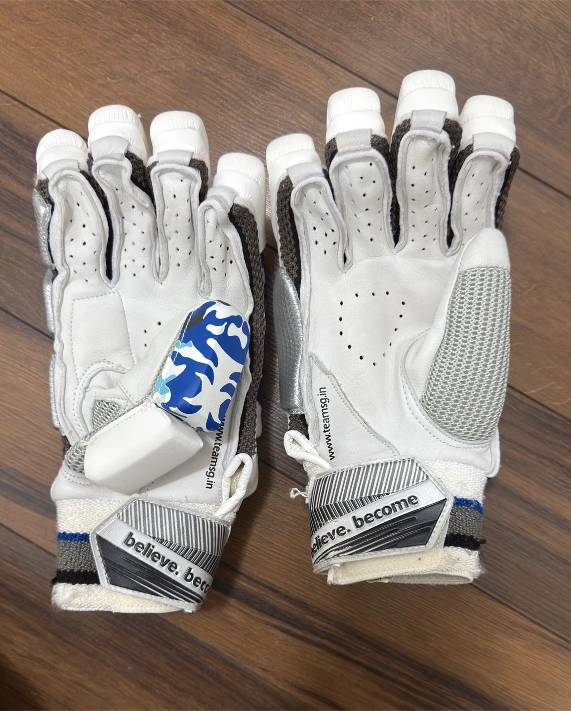Selling a pair of SG Maxlite Ultimate batting gloves. They're in great shape and ready for the cricket season! The gloves are white with blue and grey accents.