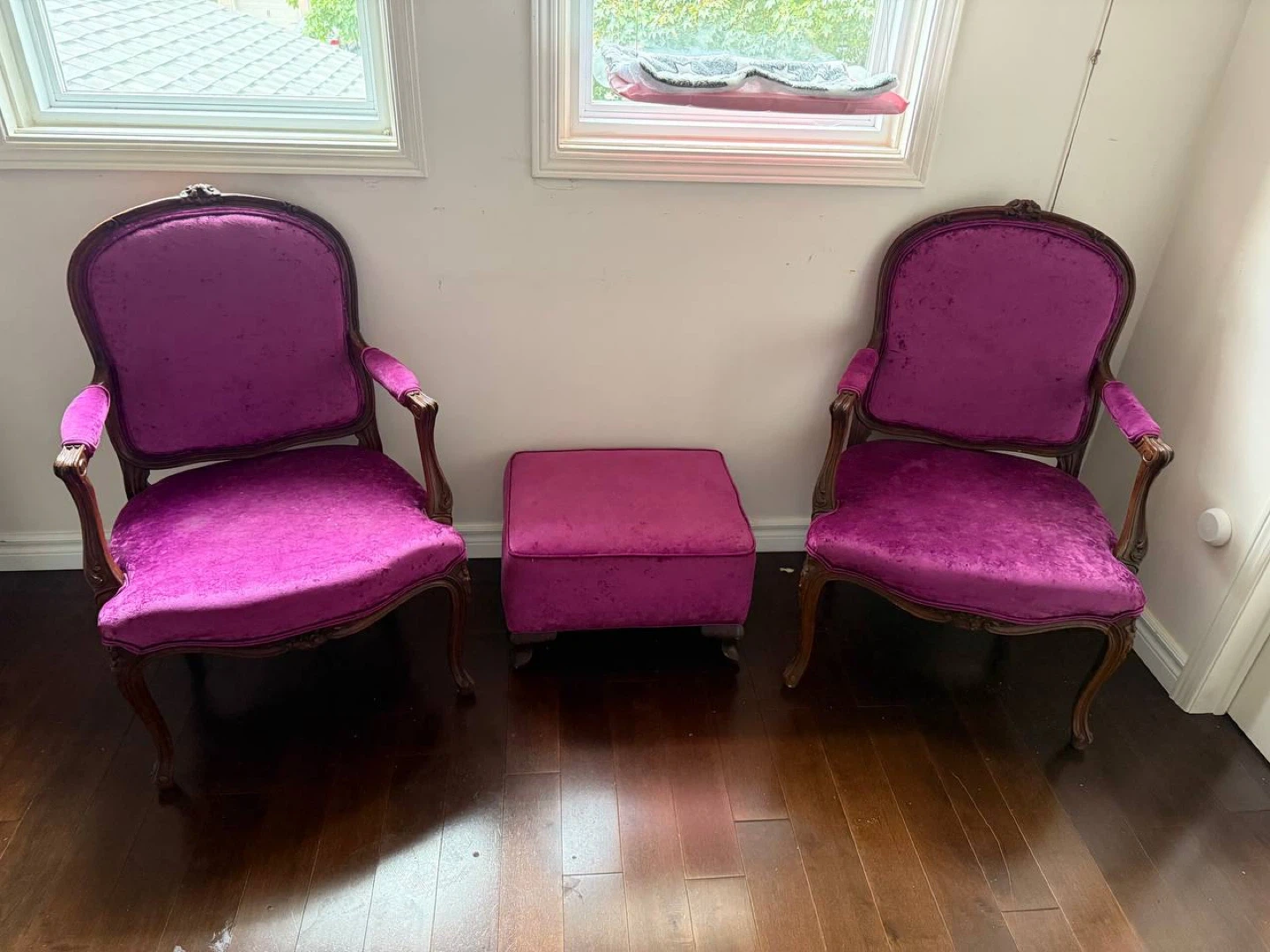 Selling a set of two antique chairs, along with a matching ottoman. The chairs and ottoman are upholstered in a vibrant purple velvet. They would make a great addition to any room!
