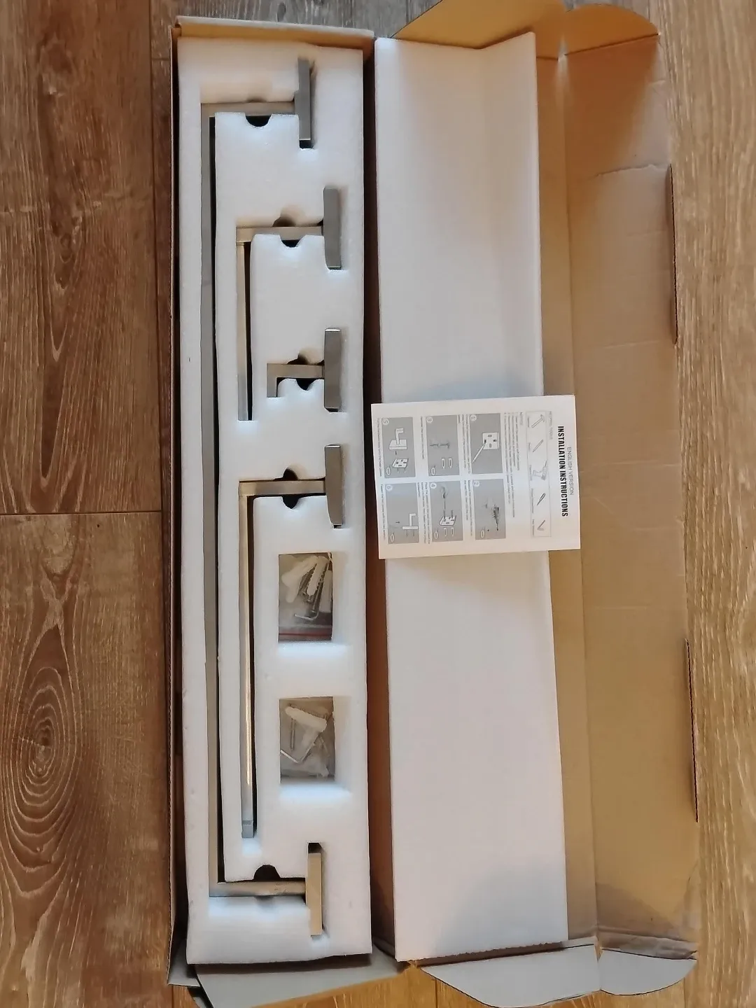 New in box set of three towel bars. Stainless steel finish. Includes installation hardware and instructions. These bars are great for bathrooms or kitchens!