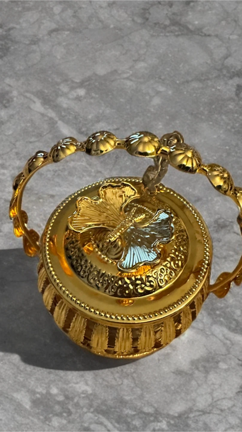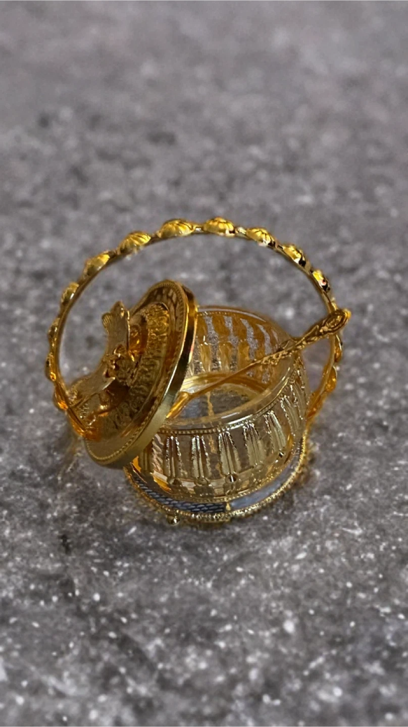Here's a beautiful decorative sugar bowl! It comes with a lid and a small spoon. Available in gold or silver colour.