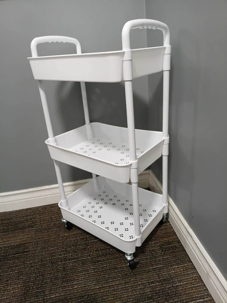 Selling a brand new, white 3-tier rolling cart! It's still in its original packaging and ready to be assembled. Perfect for adding extra storage to any room in your home or office