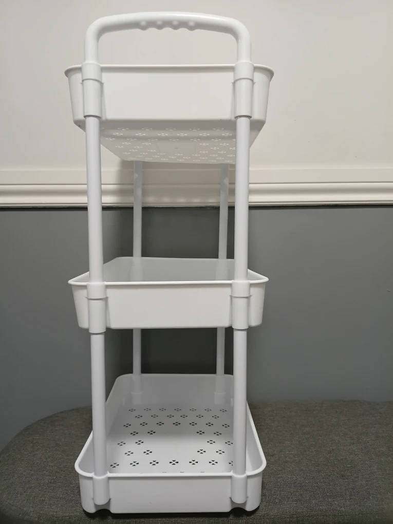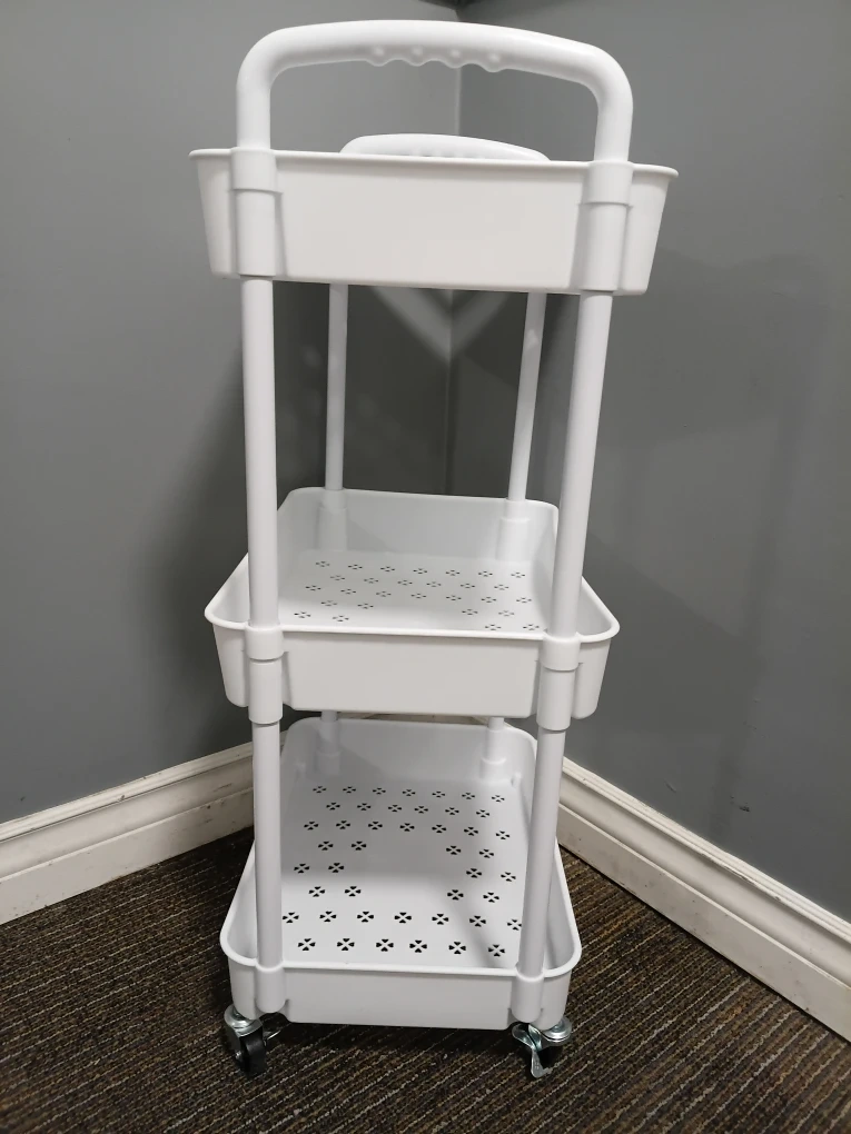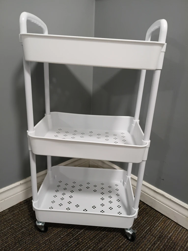 Selling a brand new, white 3-tier rolling cart! It's still in its original packaging and ready to be assembled. Perfect for adding extra storage to any room in your home or office