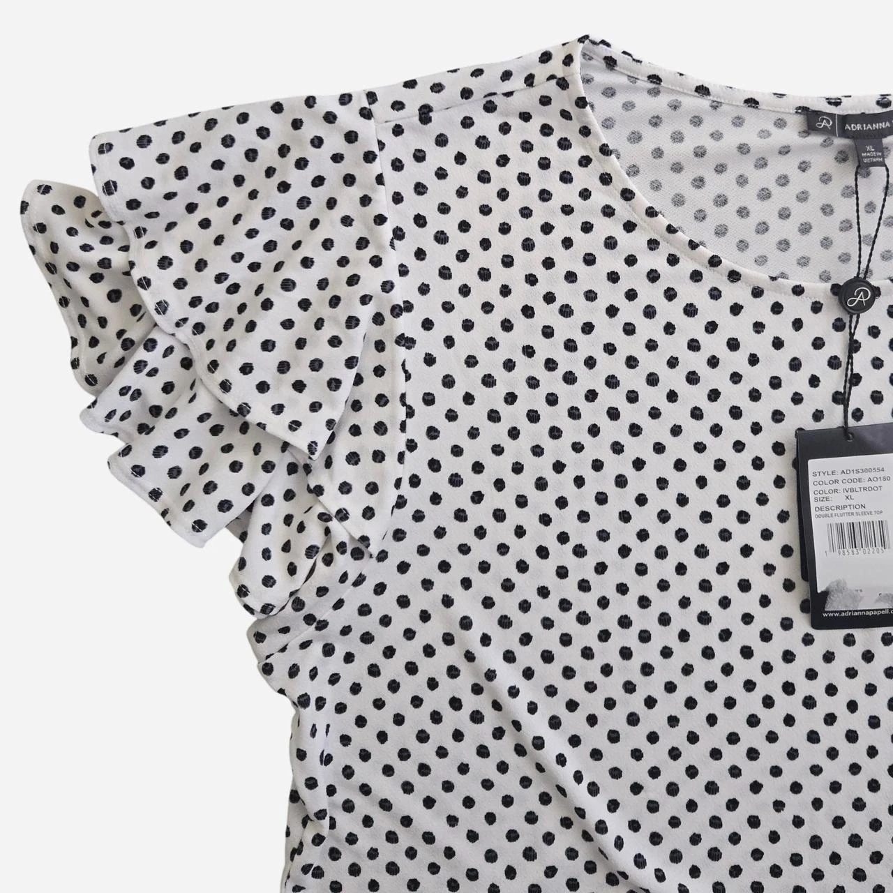 black and white top, spotted blouse, dressy casual, statement sleeves, timeless print