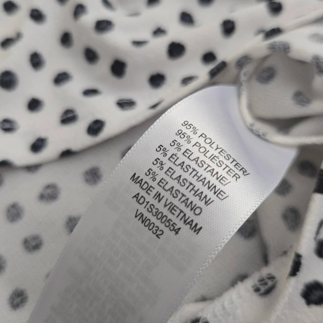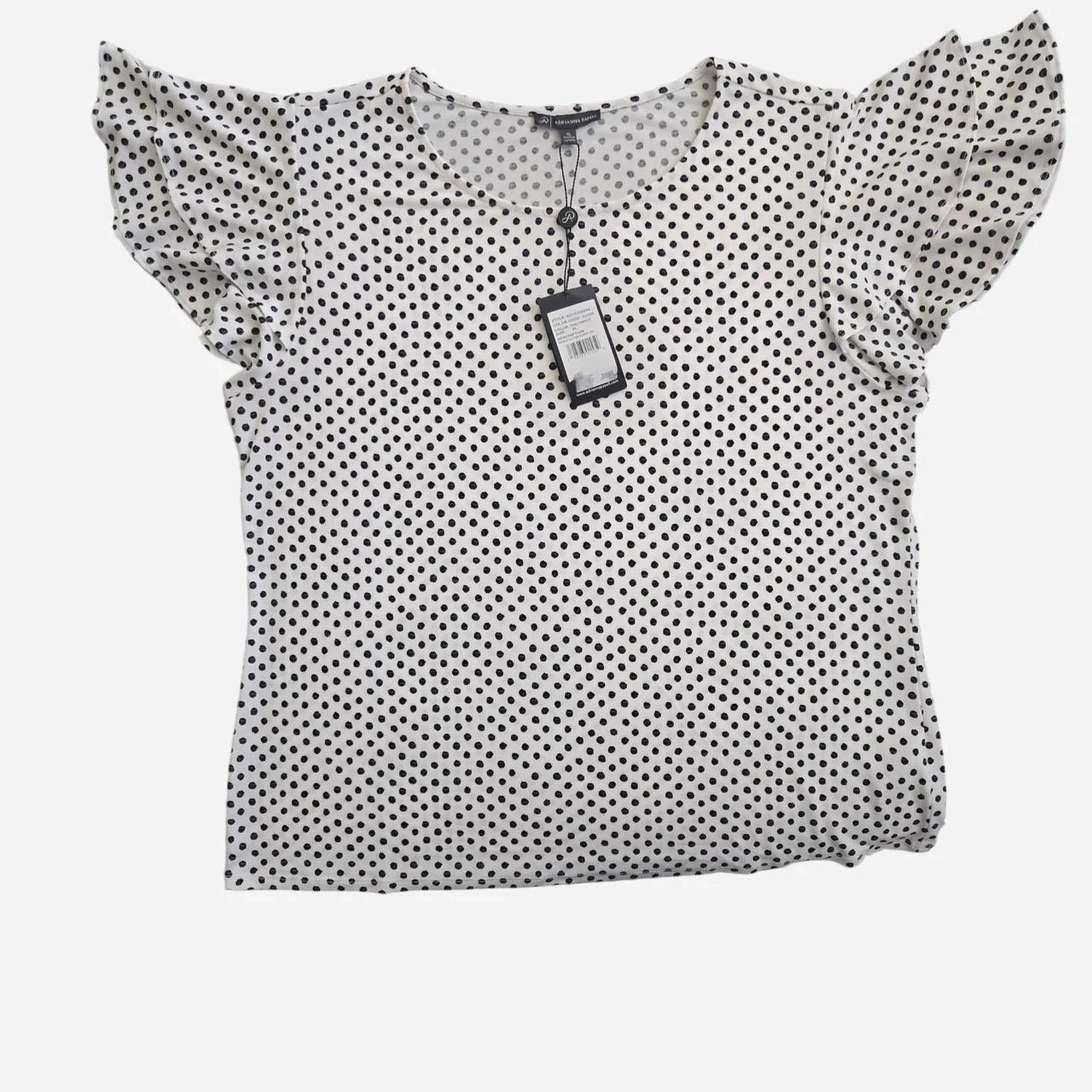 Chic black blouse with white polka dots and the cutest sleeves — slightly puffed with a feminine finish. Light, flowy fabric that drapes beautifully. Perfect for dressing up or down. Classic, timeless style with a playful twist.